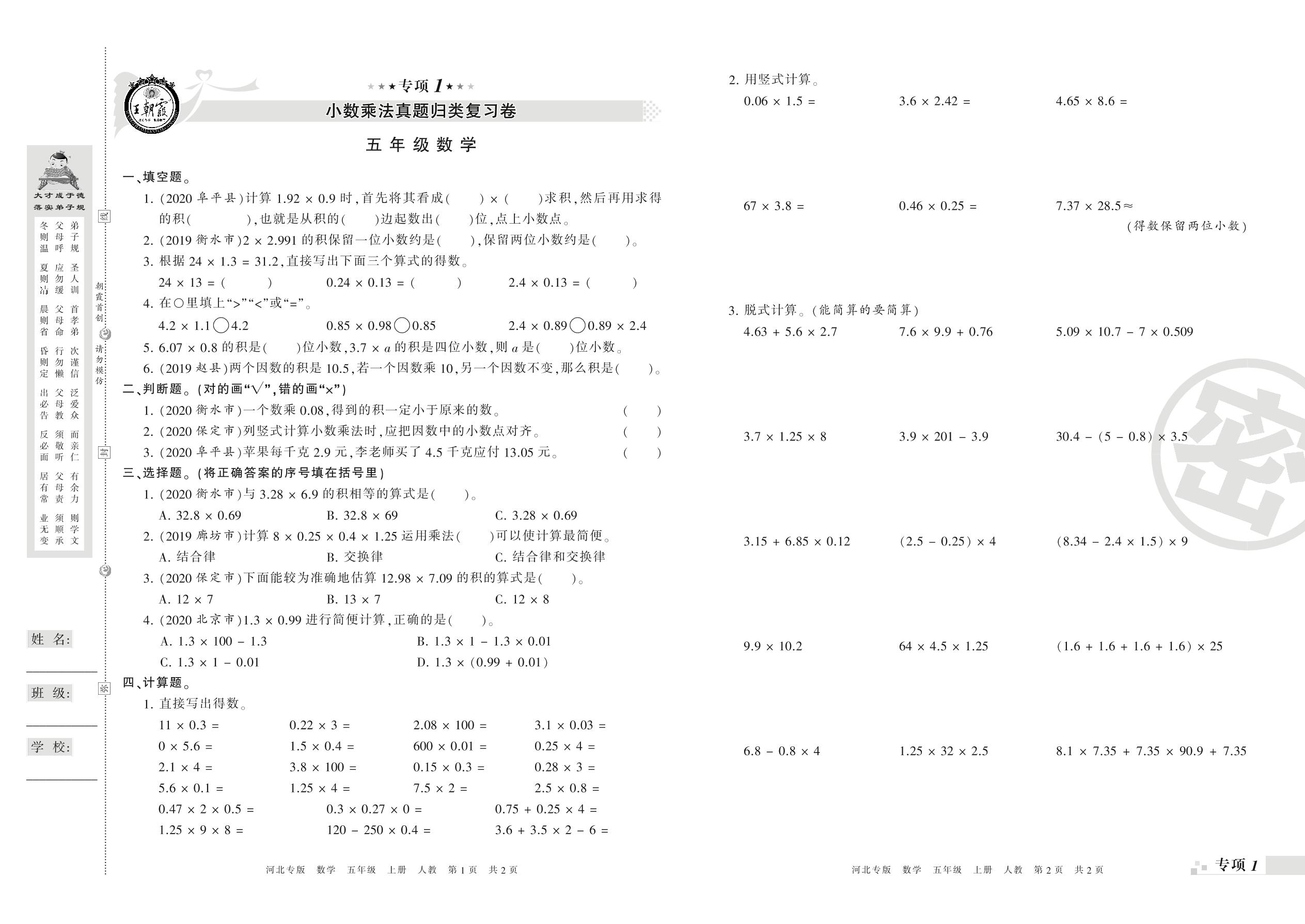 王朝霞期末专项卷——小数乘法、小数除法真题归类复习五年级上册数学(人教版)【0】