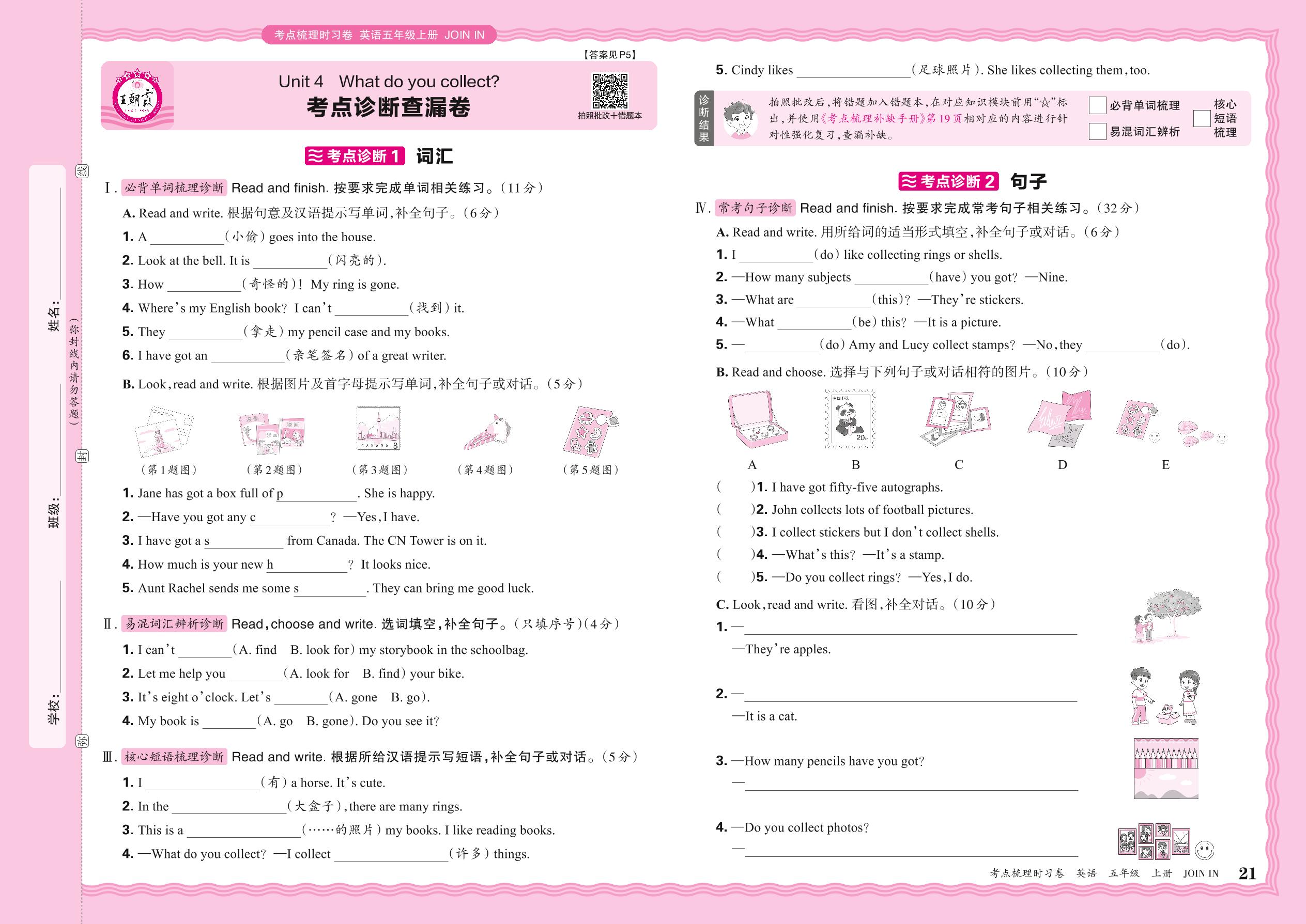 2024秋上册五年级英语剑桥版 Unit 4 考点诊断查漏卷