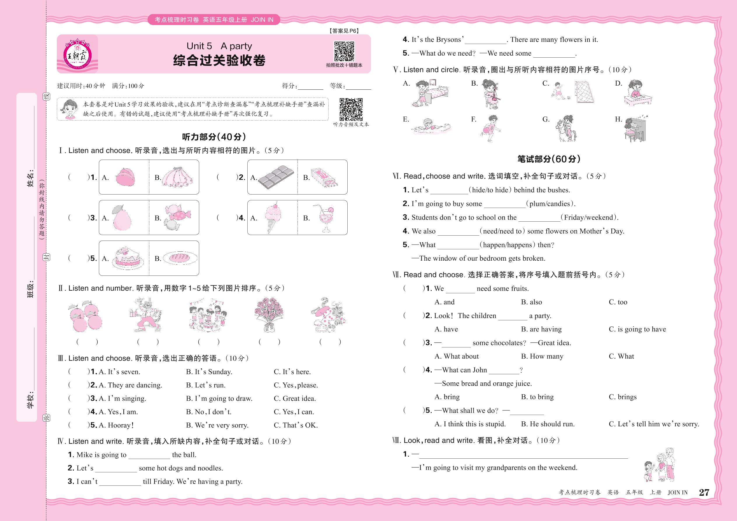 2024秋上册五年级英语剑桥版 Unit 5 综合过关验收卷