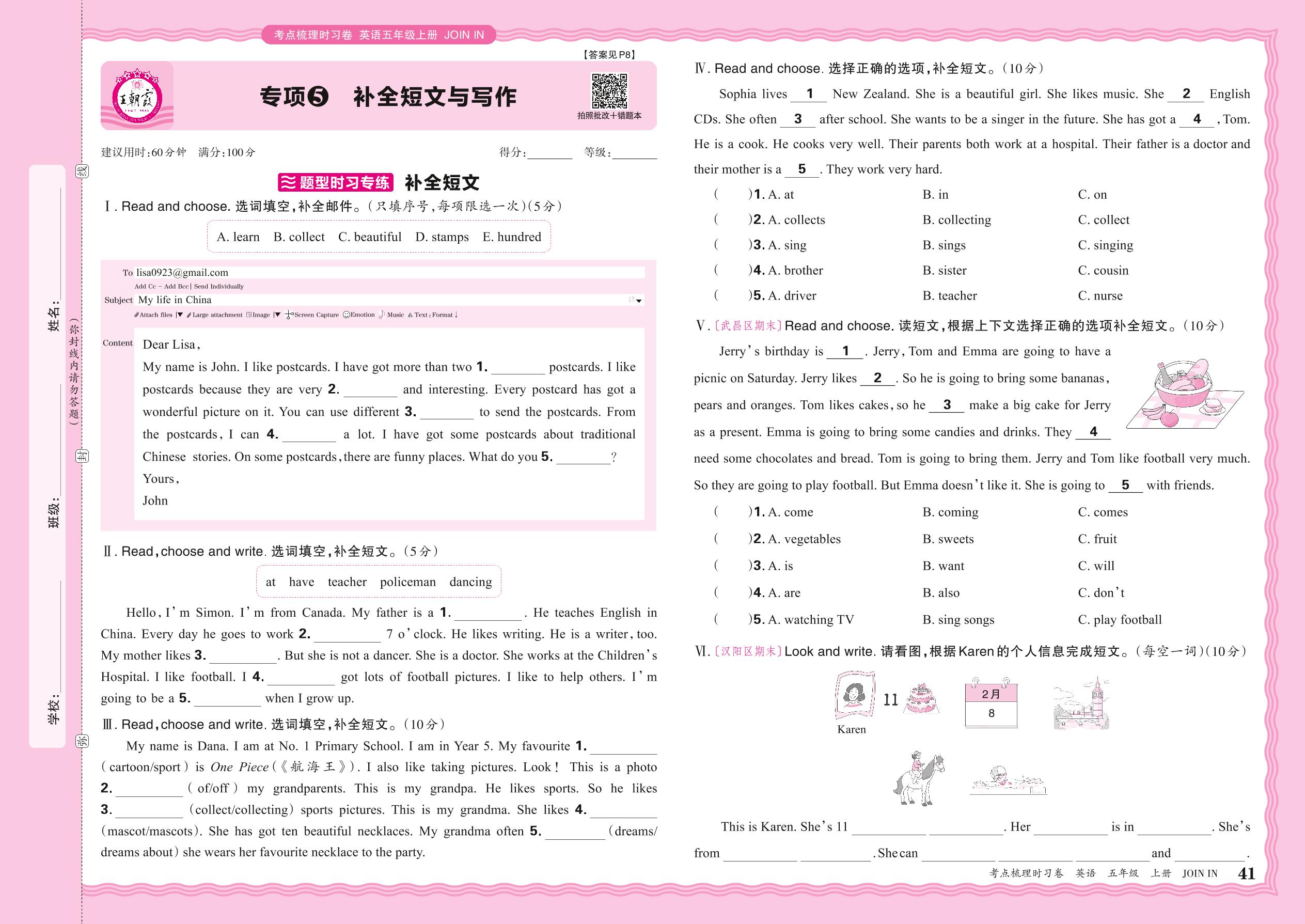2024秋上册五年级英语剑桥版 期末专项卷PY版·补全短文与写作【5】