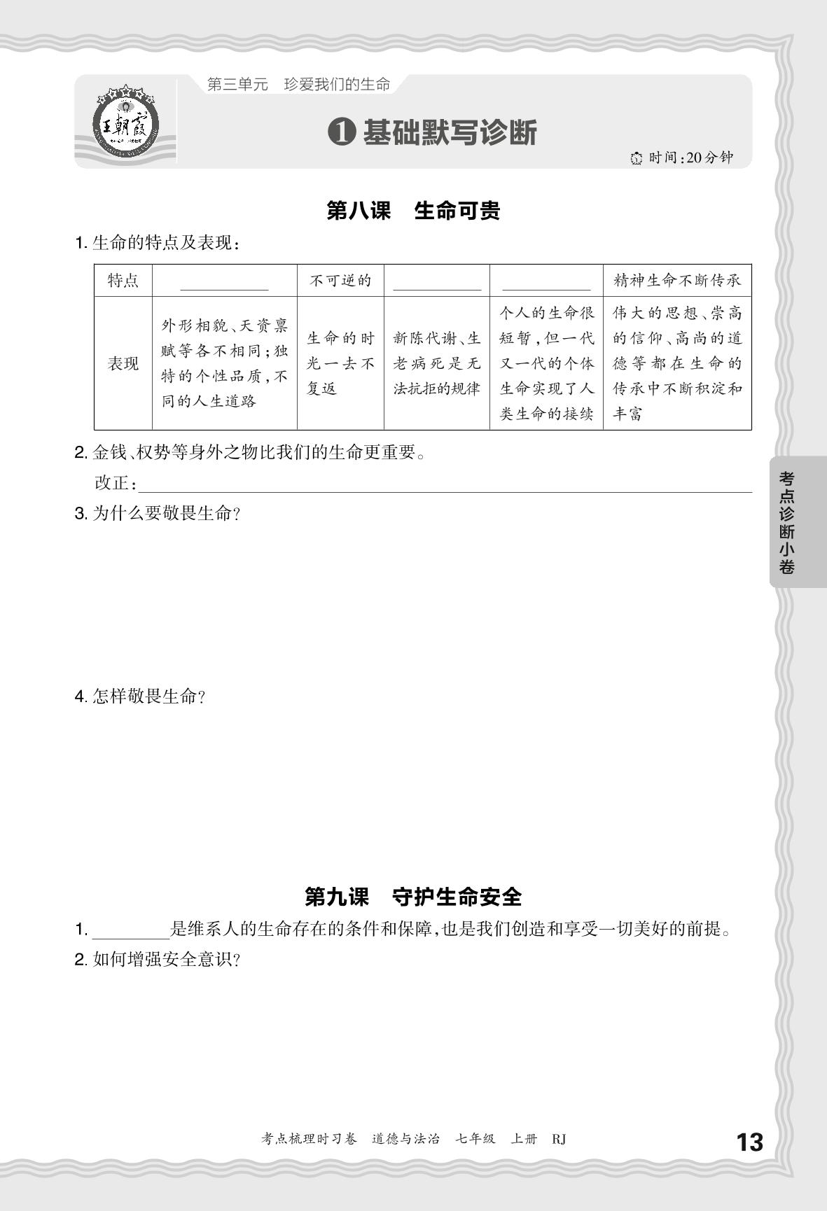 2024秋上册七年级道德与法治人教版 第三单元 考点诊断小卷 基础默写诊断【1】
