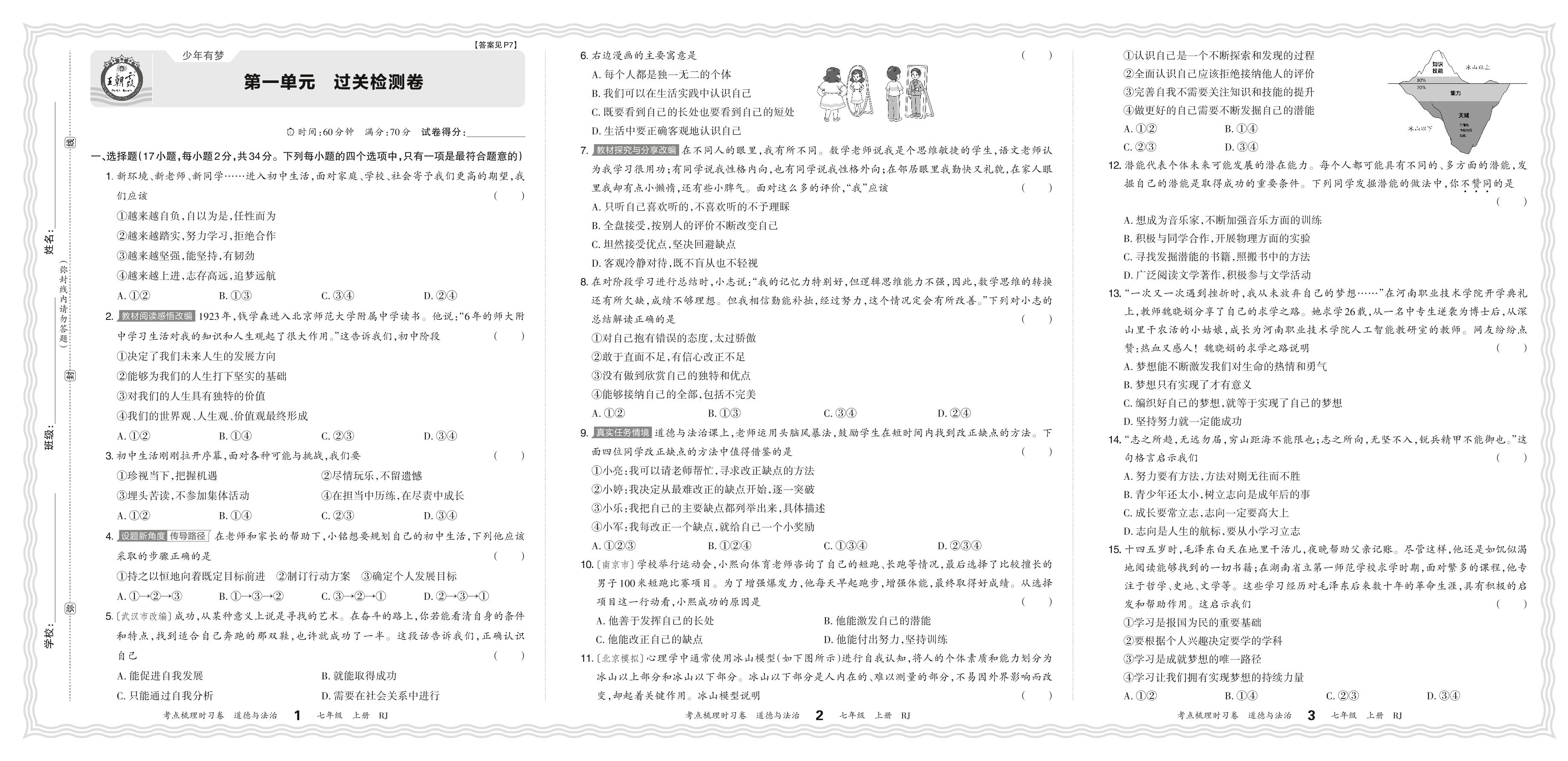 2024秋上册七年级道德与法治人教版 第一单元 过关检测卷