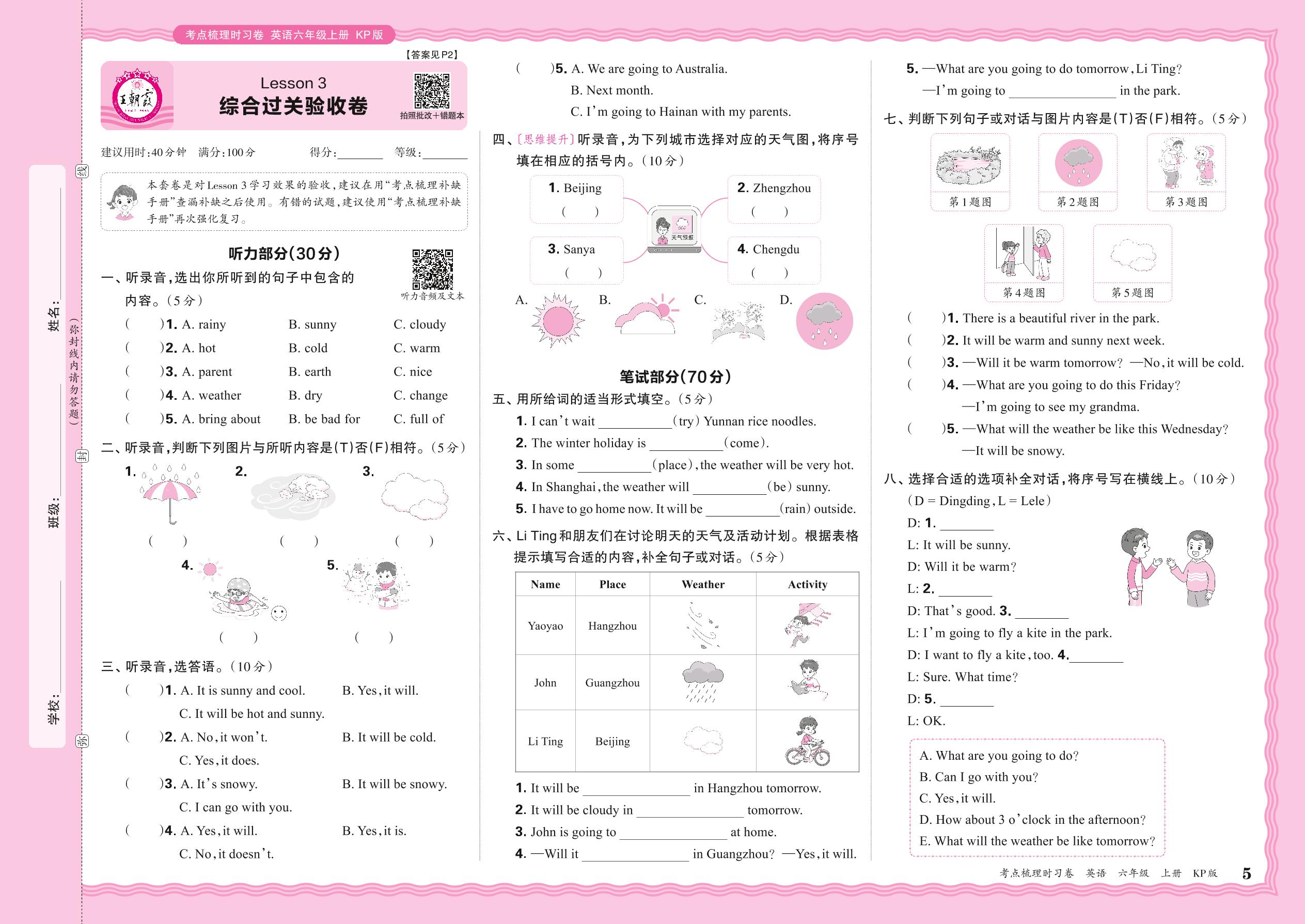 2024秋上册六年级英语科普版 Lesson 3 综合过关验收卷