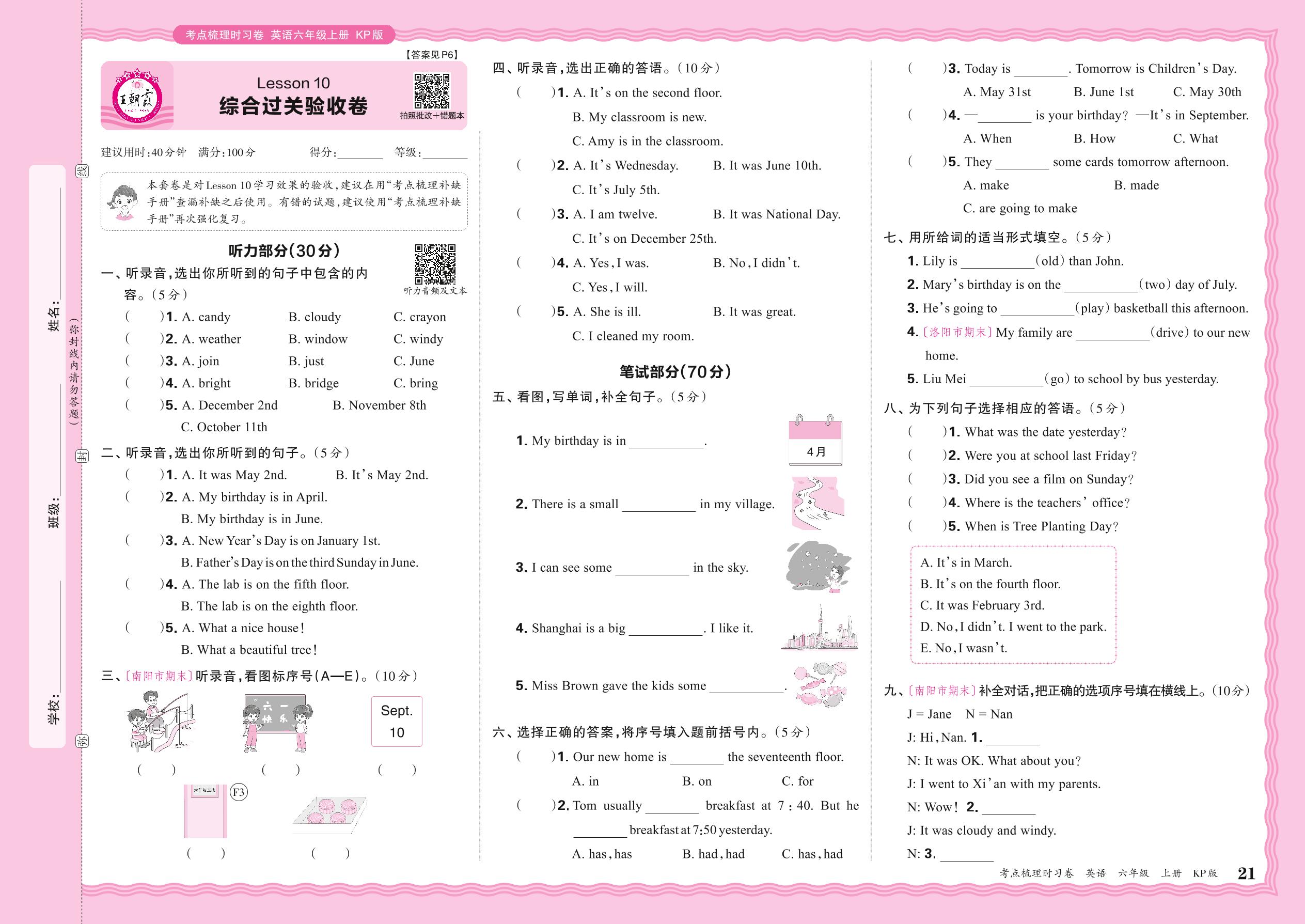 2024秋上册六年级英语科普版 Lesson 10 综合过关验收卷