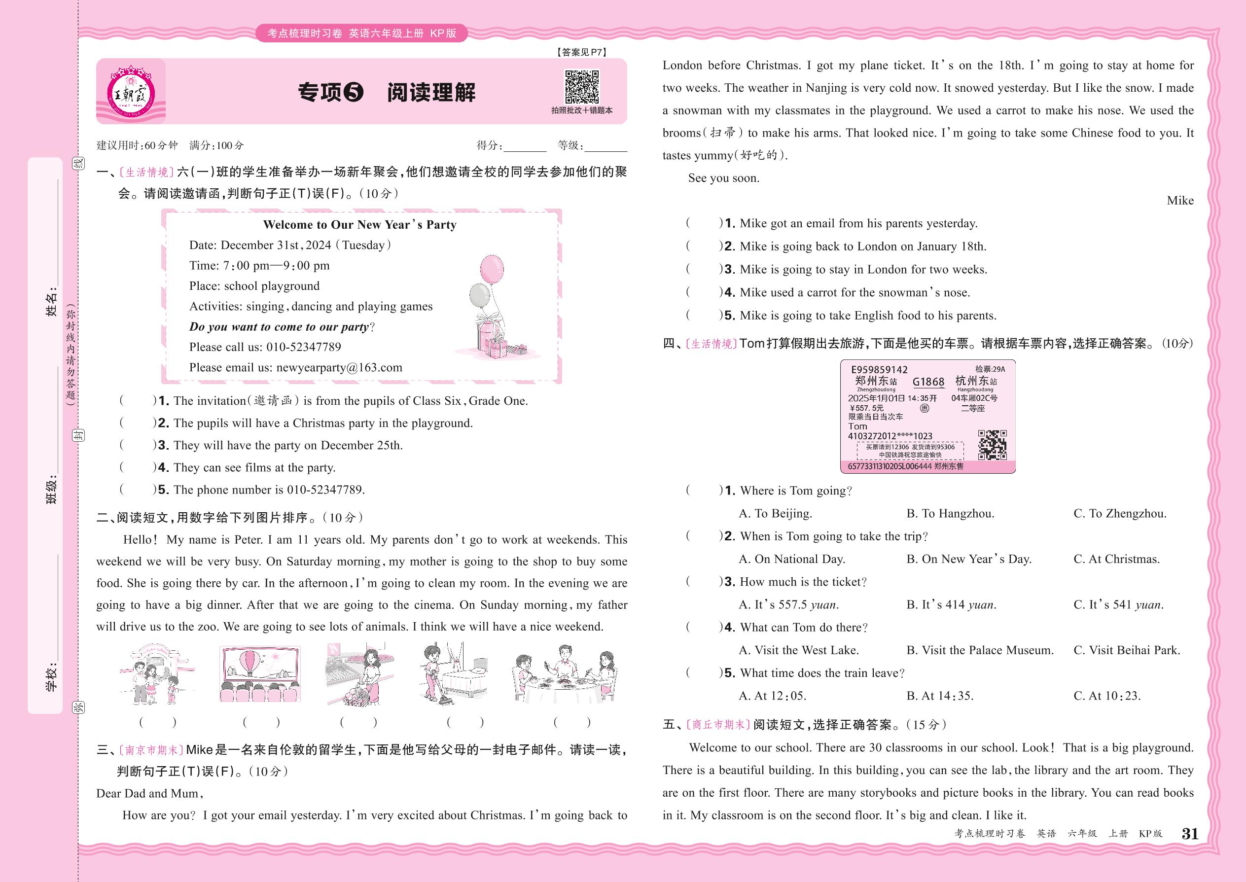 2024秋上册六年级英语科普版 期末专项卷KD版·阅读理解【5】