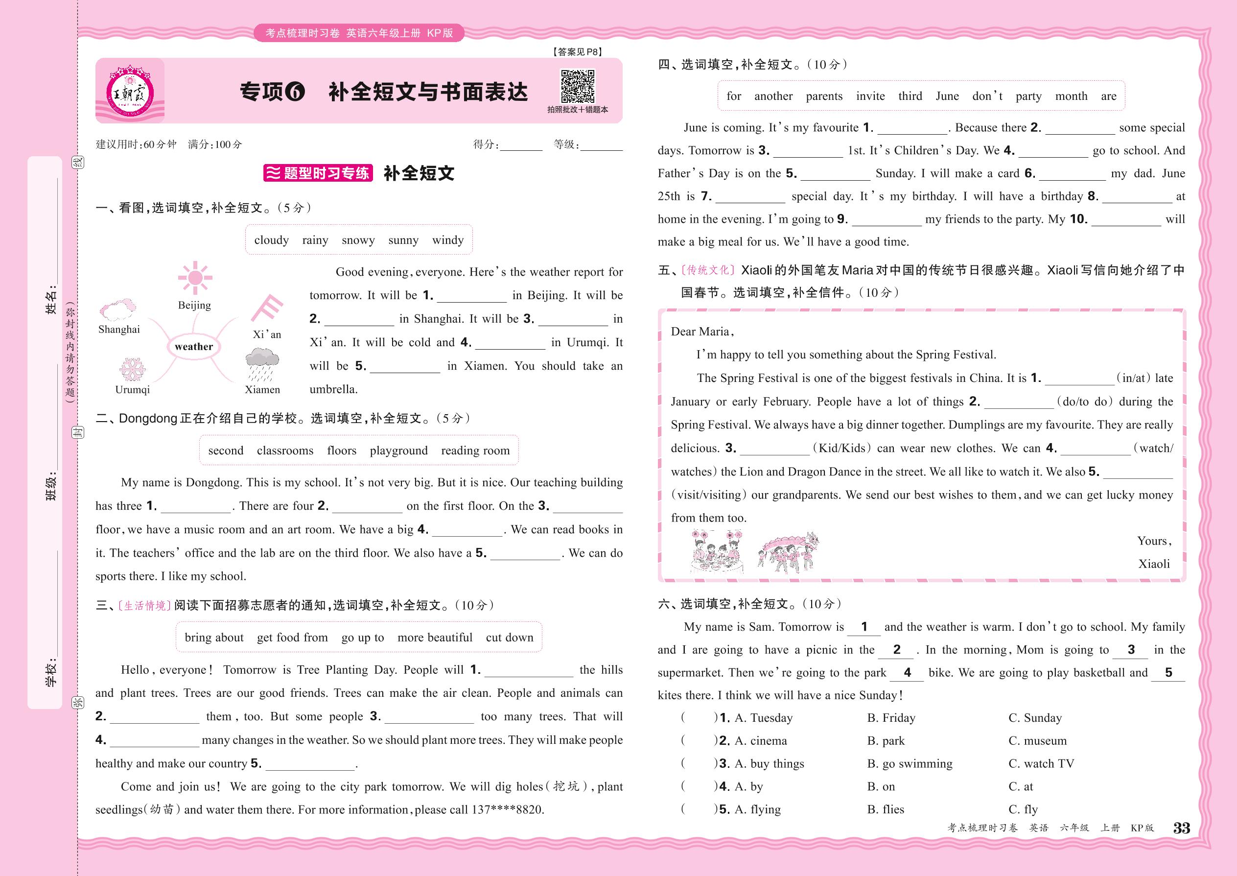 2024秋上册六年级英语科普版 期末专项卷KD版·补全短文与书面表达【6】