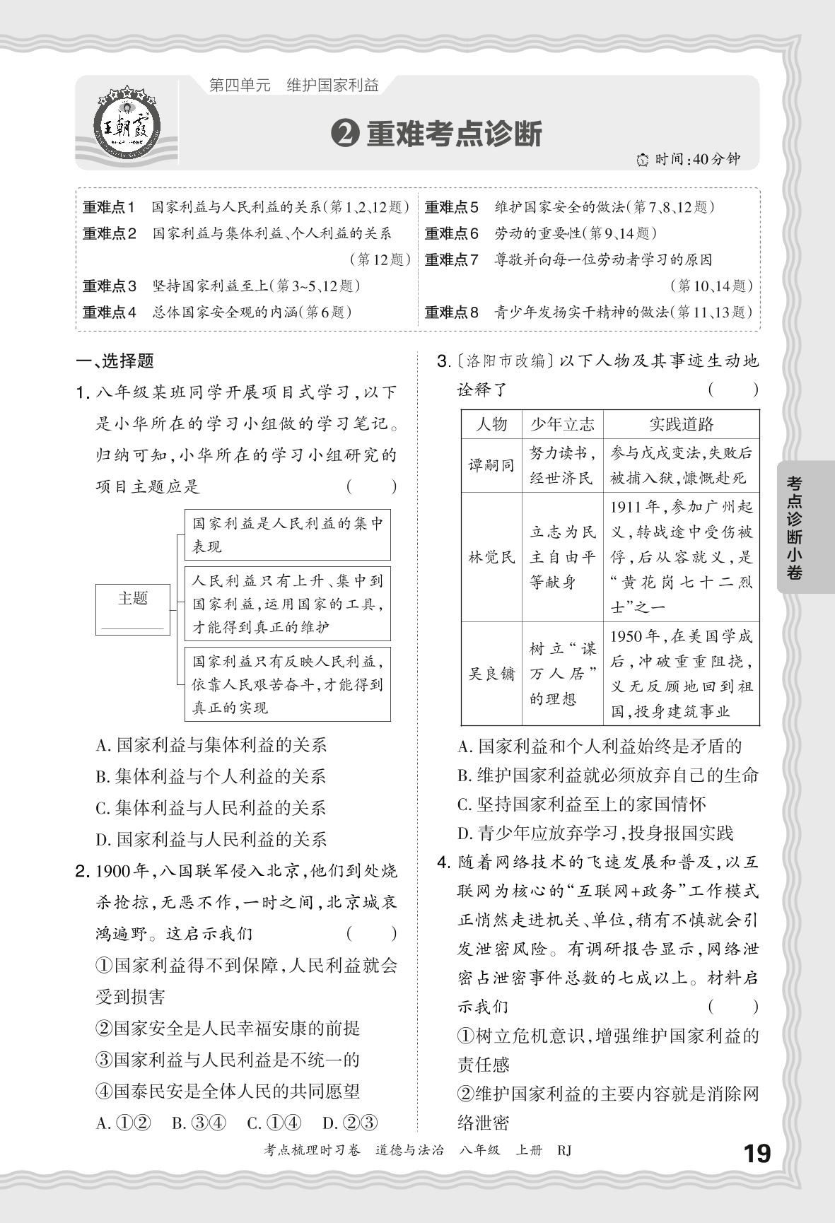 2024秋上册八年级道德与法治人教版 第四单元 考点诊断小卷 重难考点诊断【2】