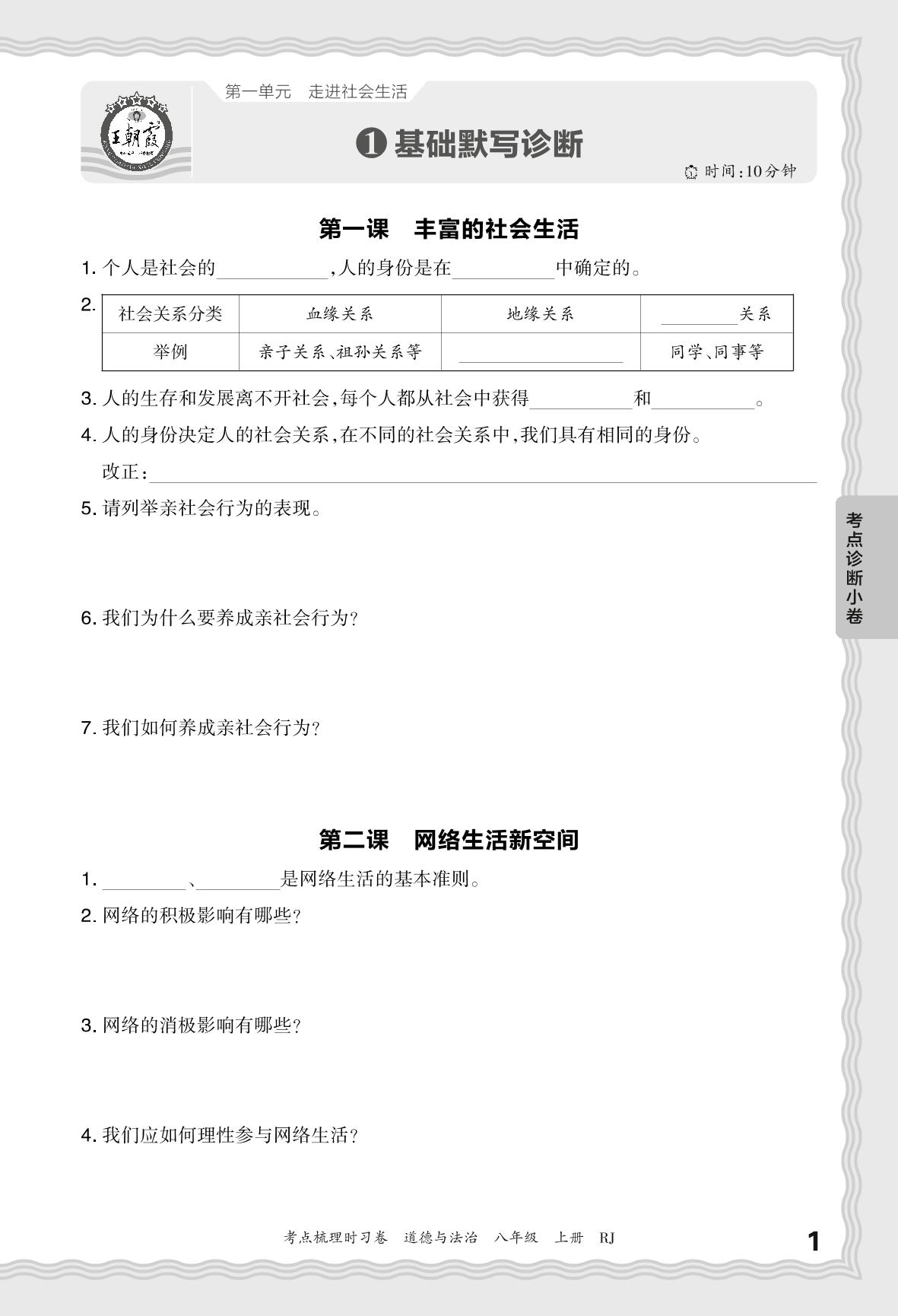 2024秋上册八年级道德与法治人教版 第一单元 考点诊断小卷 基础默写诊断【1】