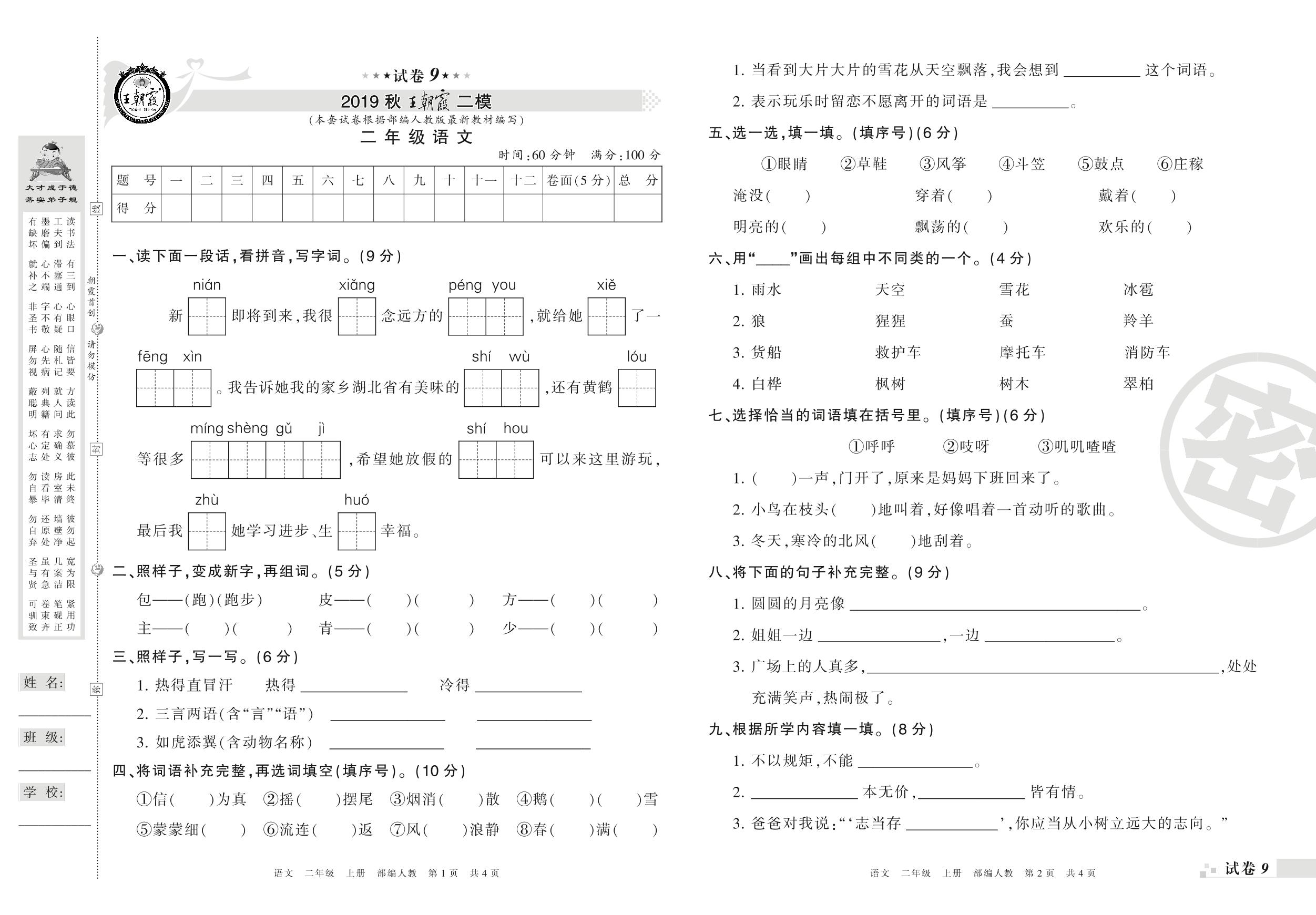 王朝霞期末模拟卷二年级上册语文(人教版)_R21080170955【9】