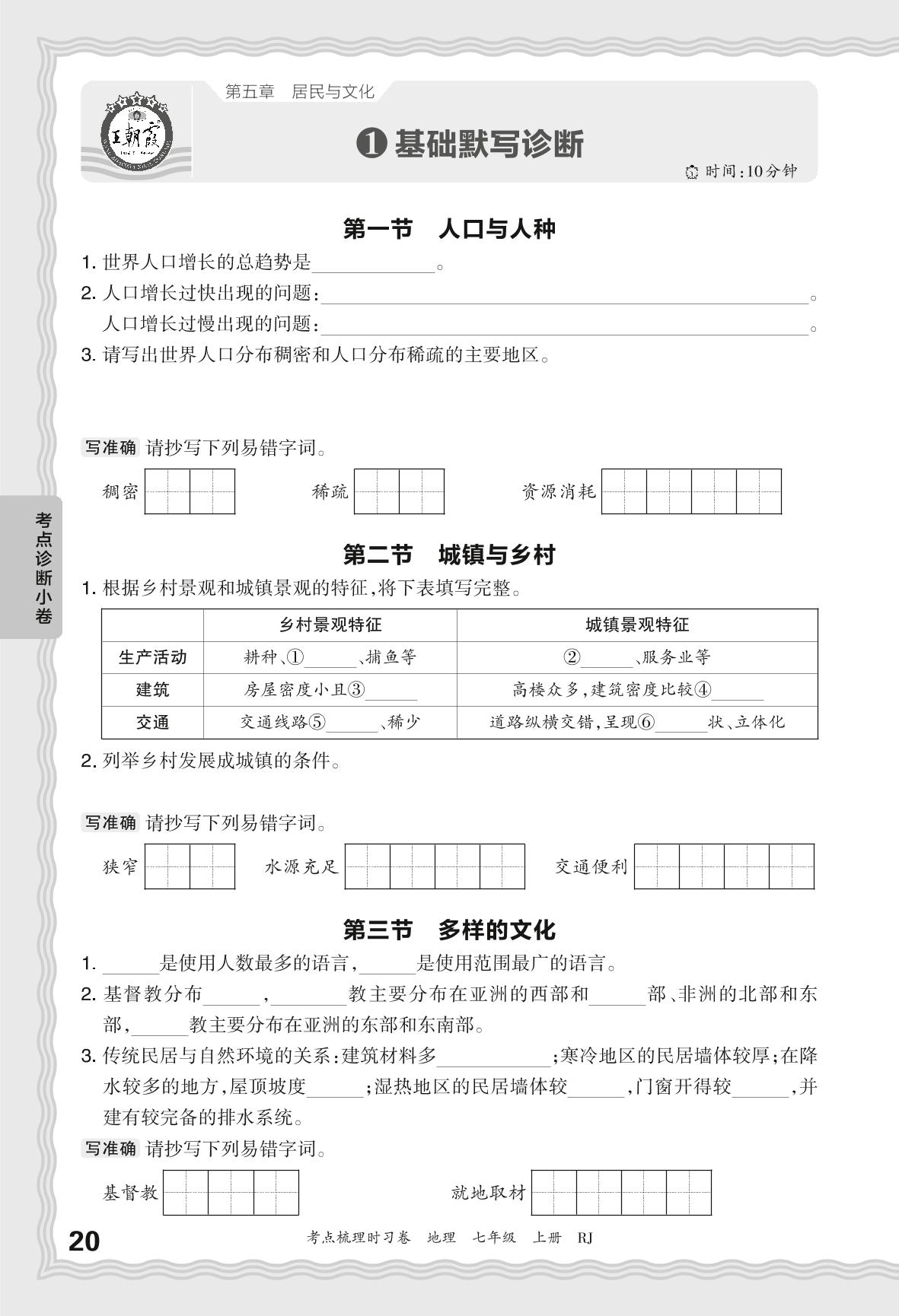 2024秋上册七年级地理人教版 第五章 考点诊断小卷 基础默写诊断【1】