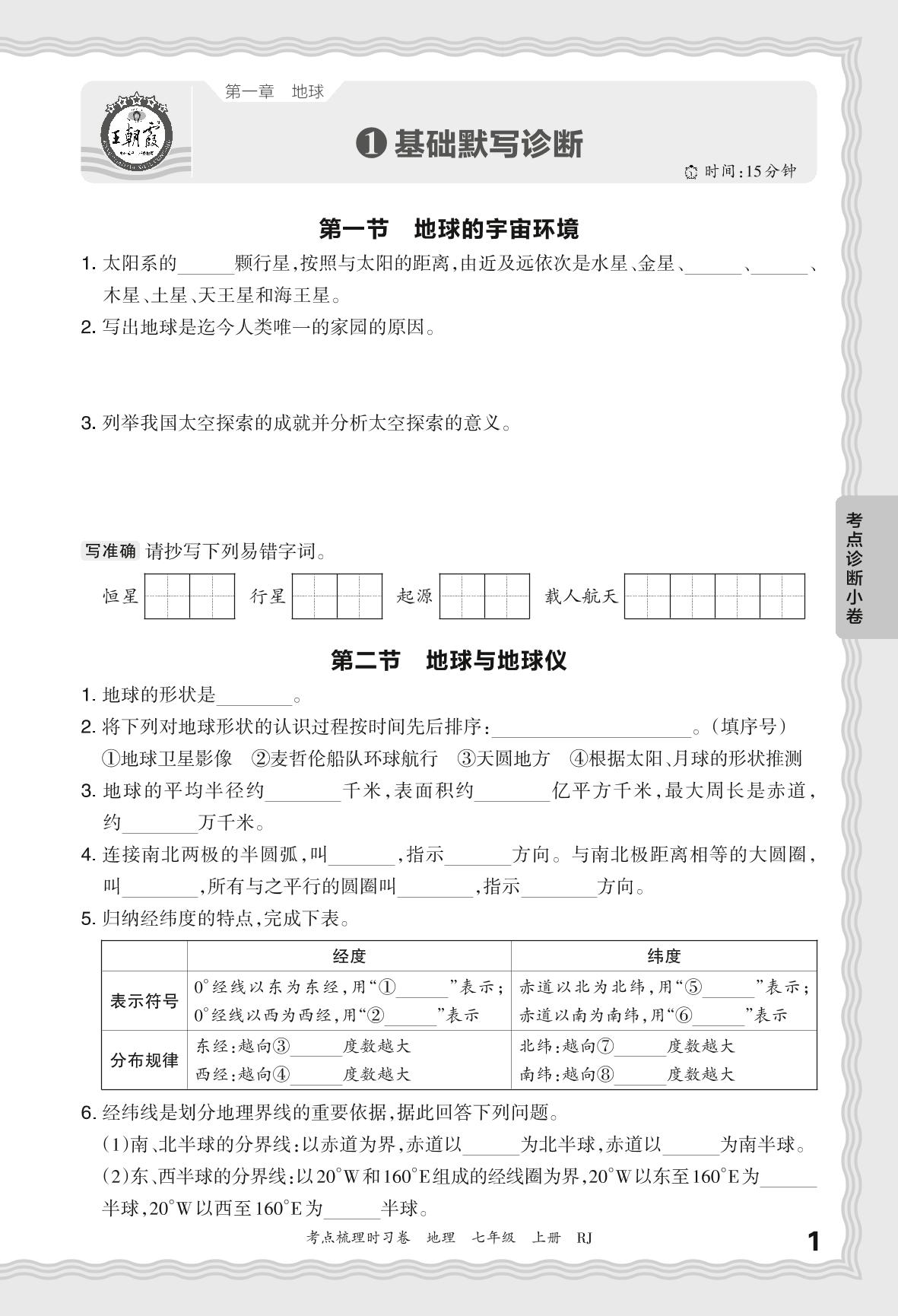 2024秋上册七年级地理人教版 第一章 考点诊断小卷 基础默写诊断【1】