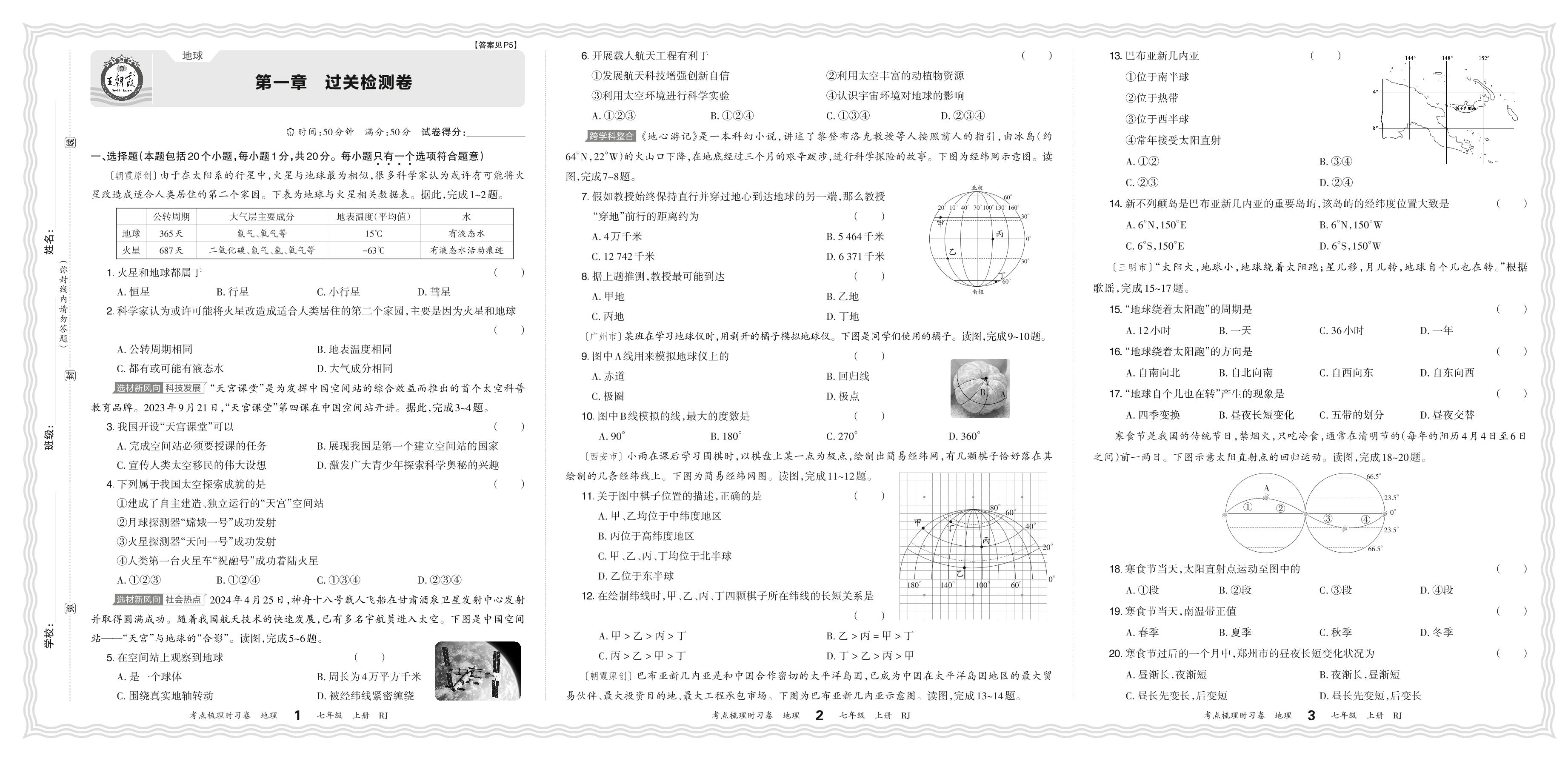 2024秋上册七年级地理人教版 第一章 过关检测卷