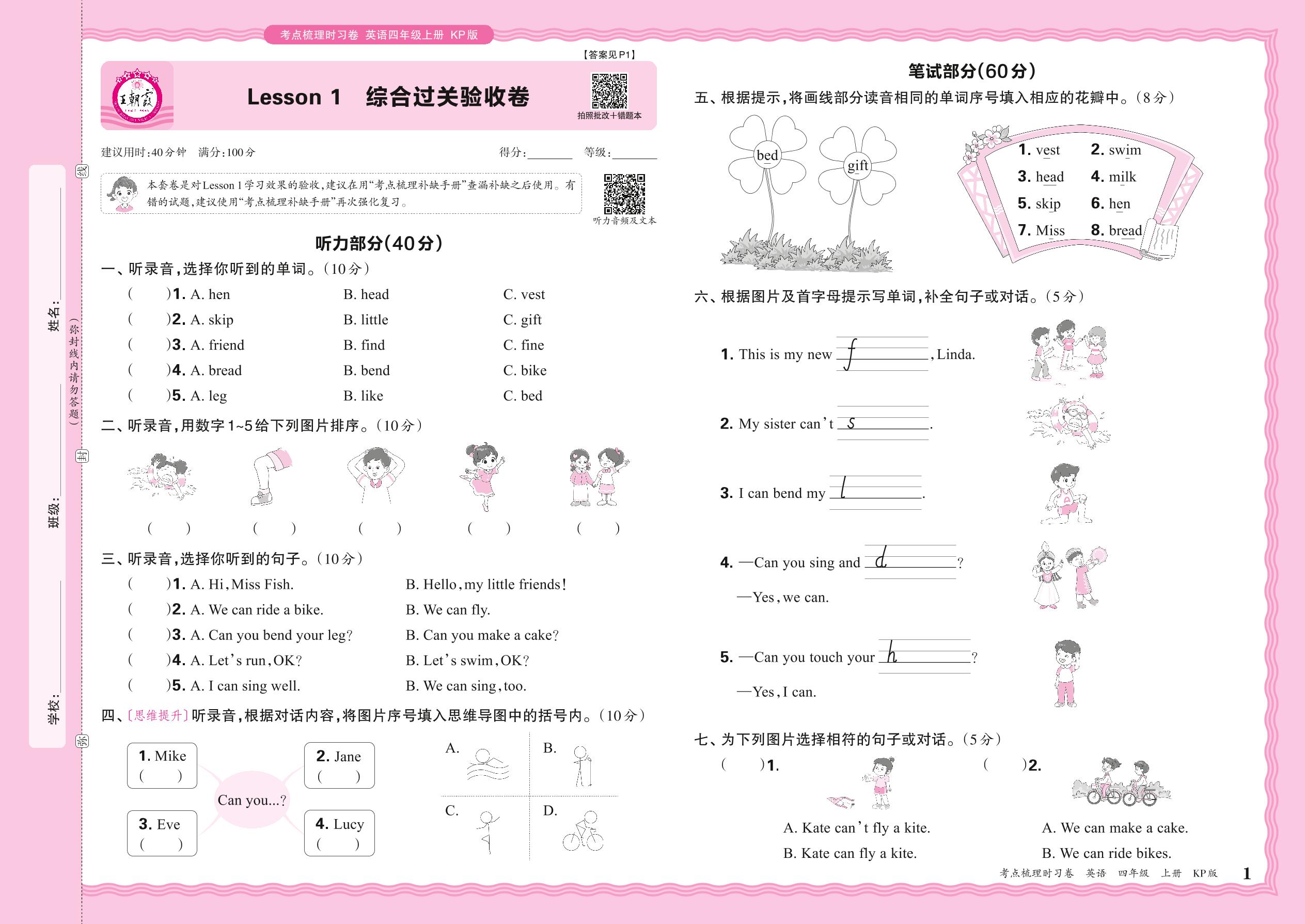 2024秋上册四年级英语科普版 Lesson 1 综合过关验收卷