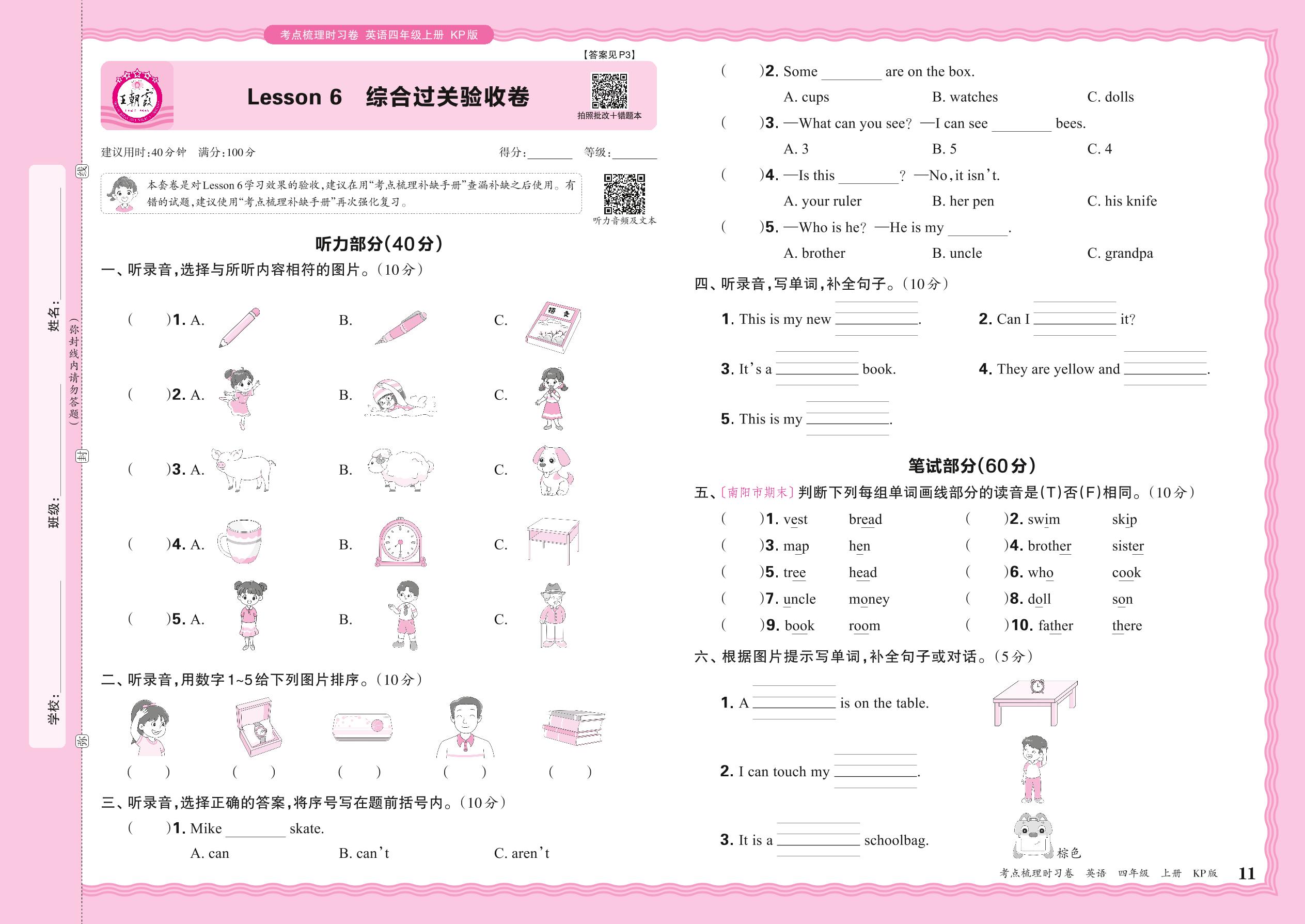 2024秋上册四年级英语科普版 Lesson 6 综合过关验收卷