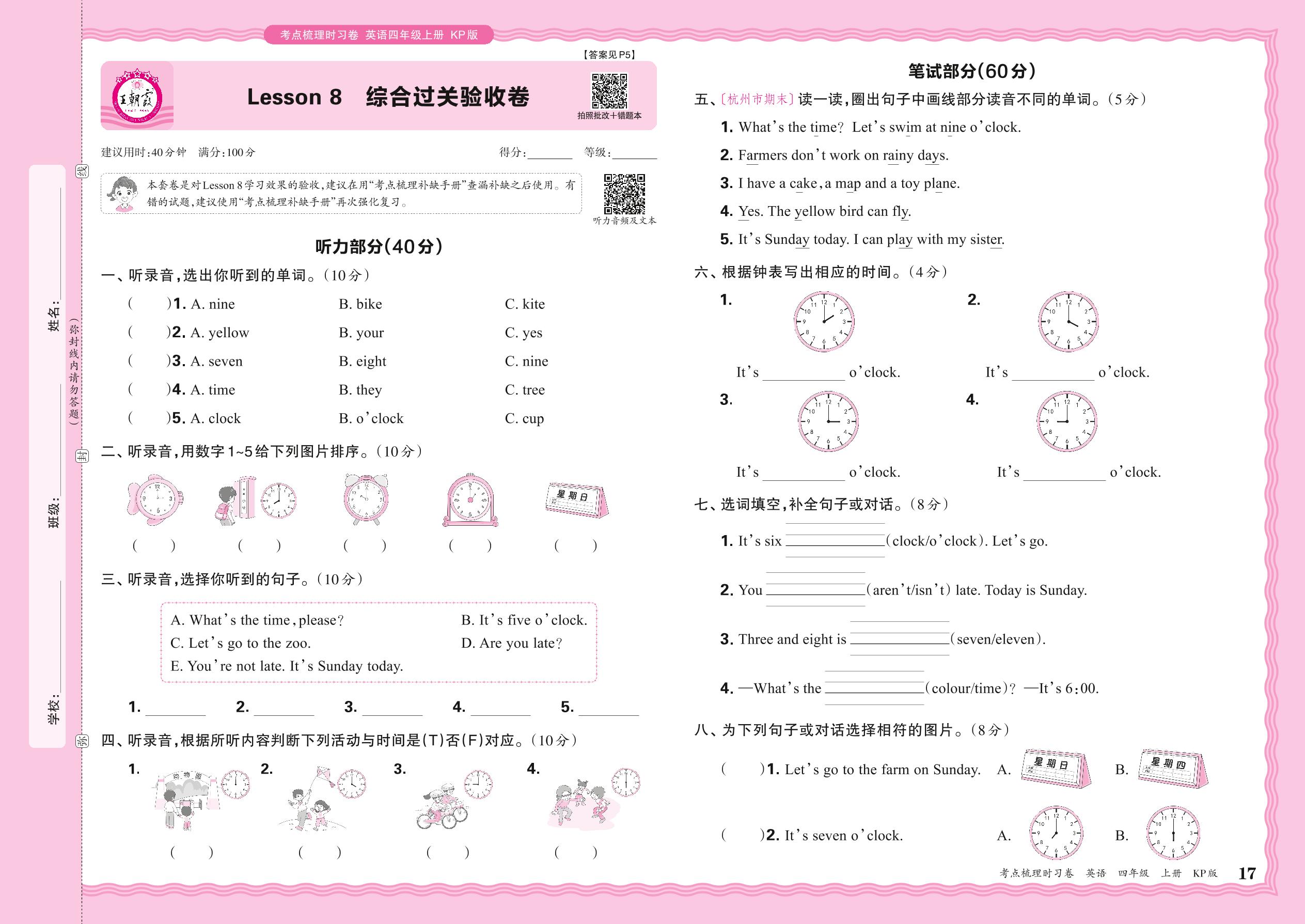 2024秋上册四年级英语科普版 Lesson 8 综合过关验收卷