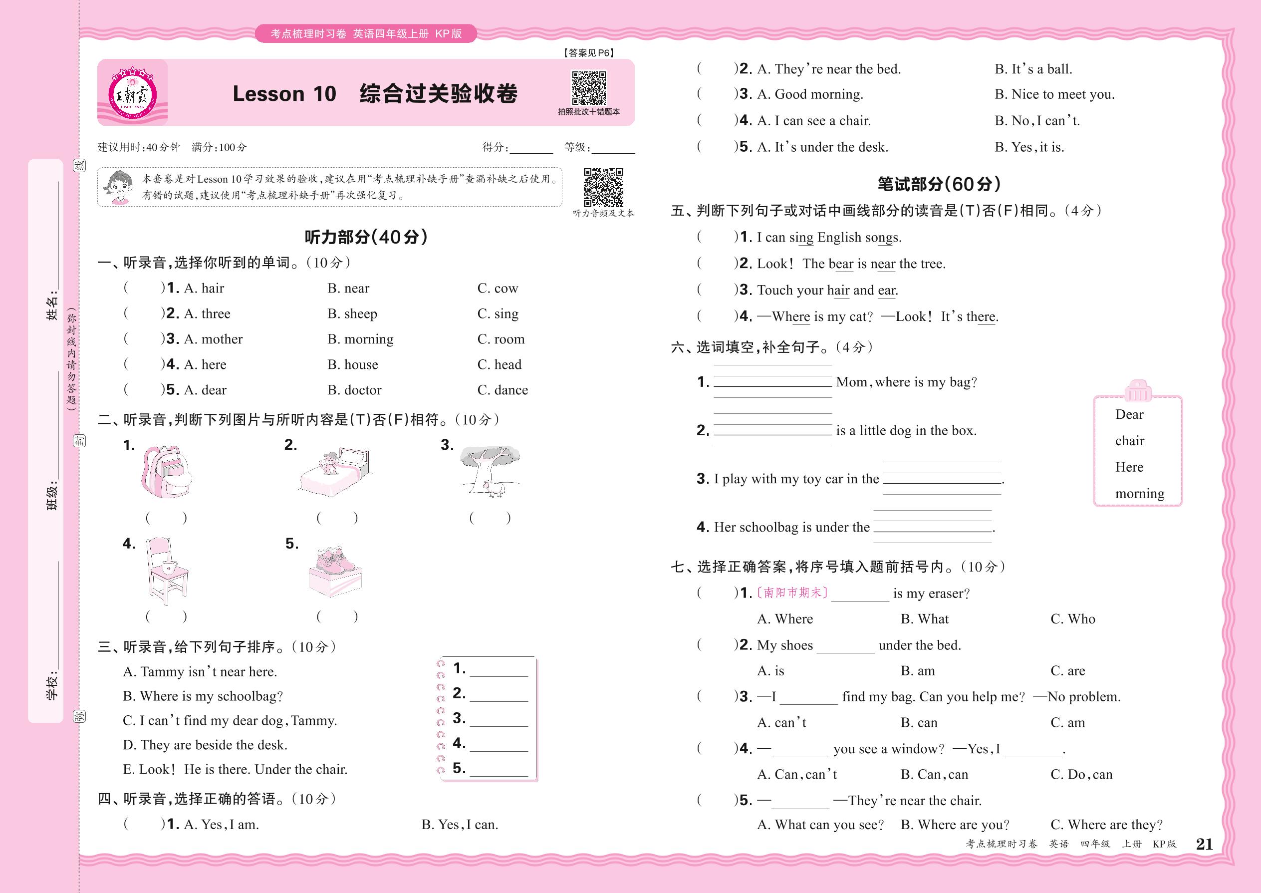 2024秋上册四年级英语科普版 Lesson 10 综合过关验收卷