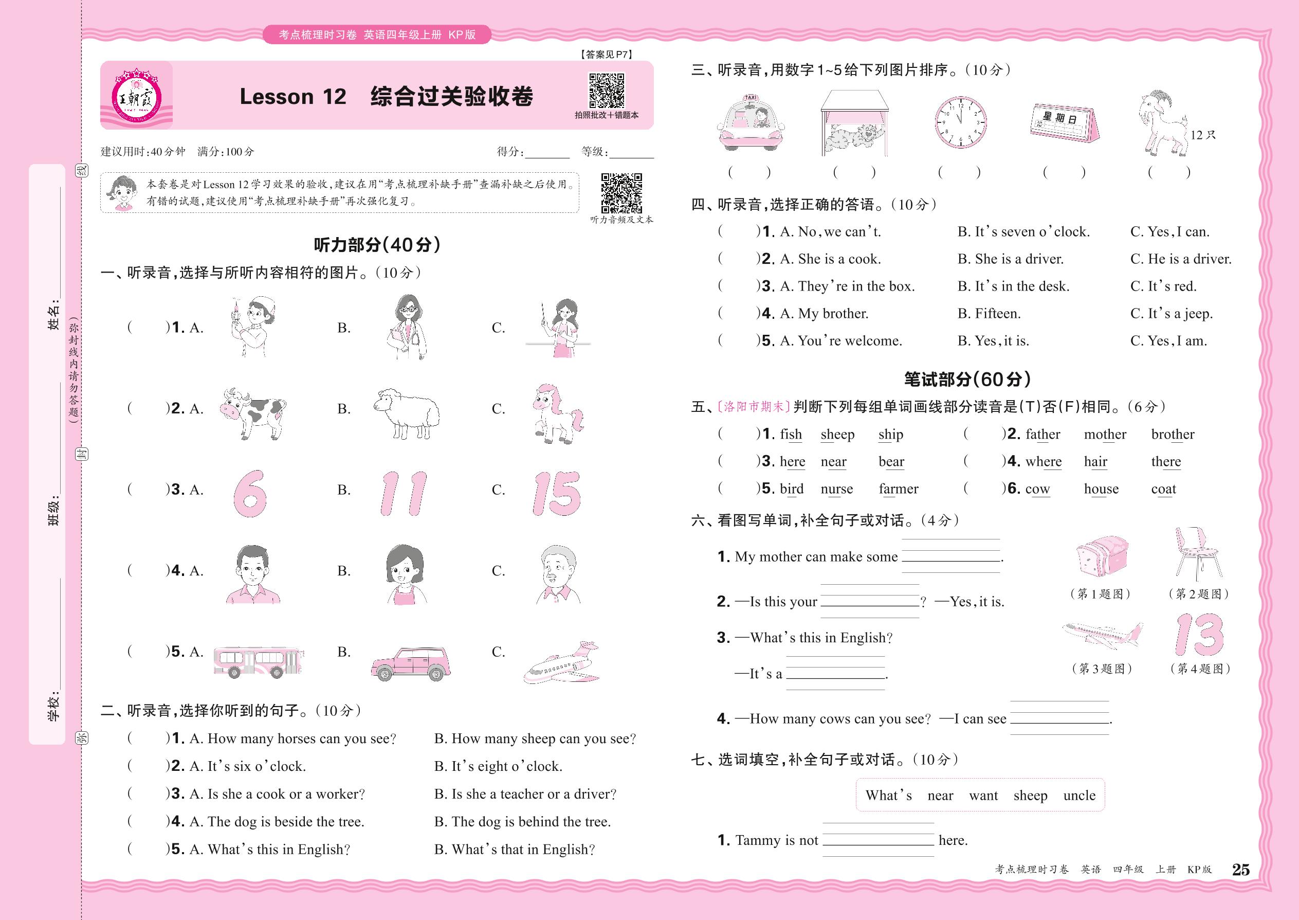 2024秋上册四年级英语科普版 Lesson 12 综合过关验收卷