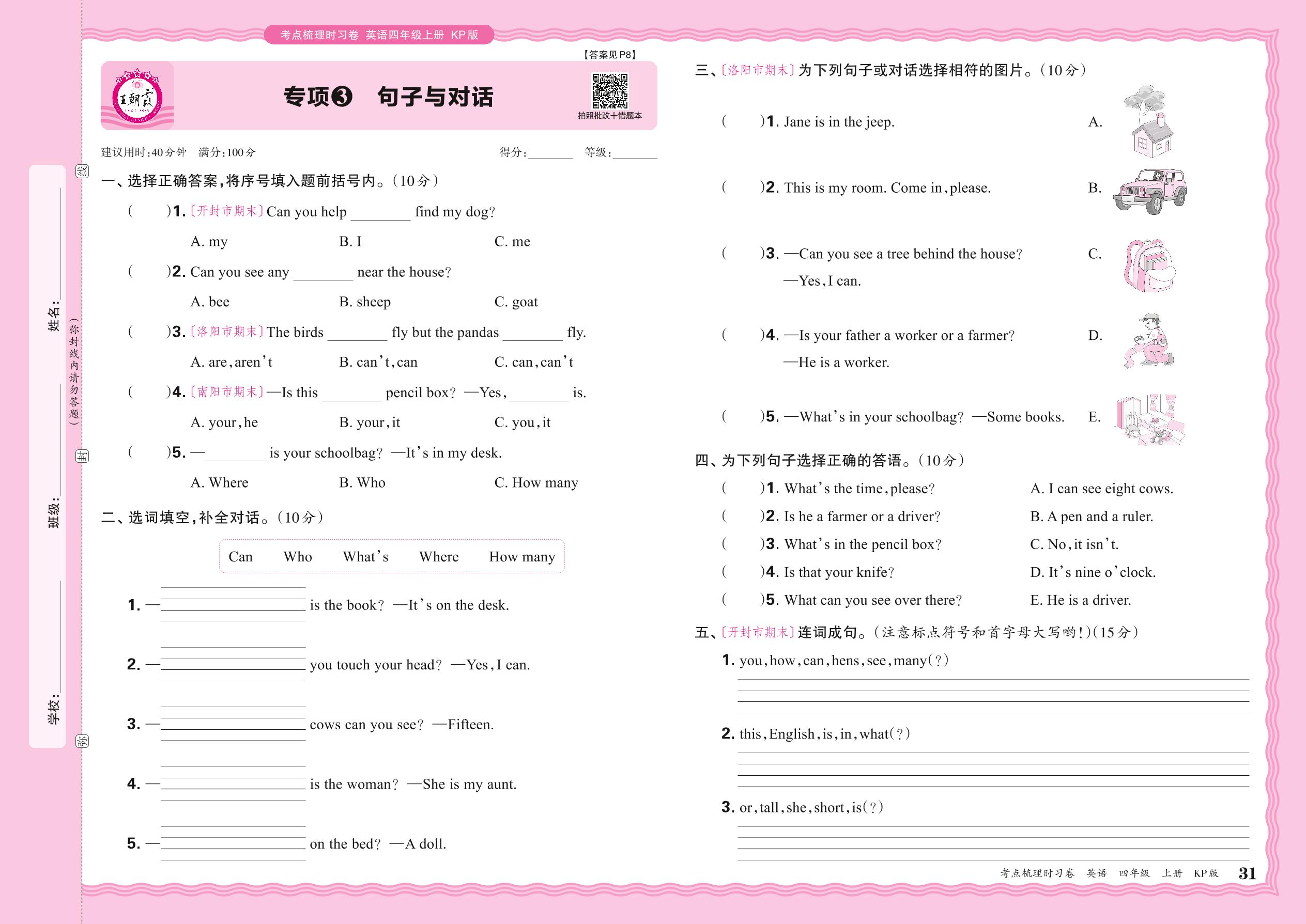 2024秋上册四年级英语科普版 期末专项卷KD版·句子与对话【3】