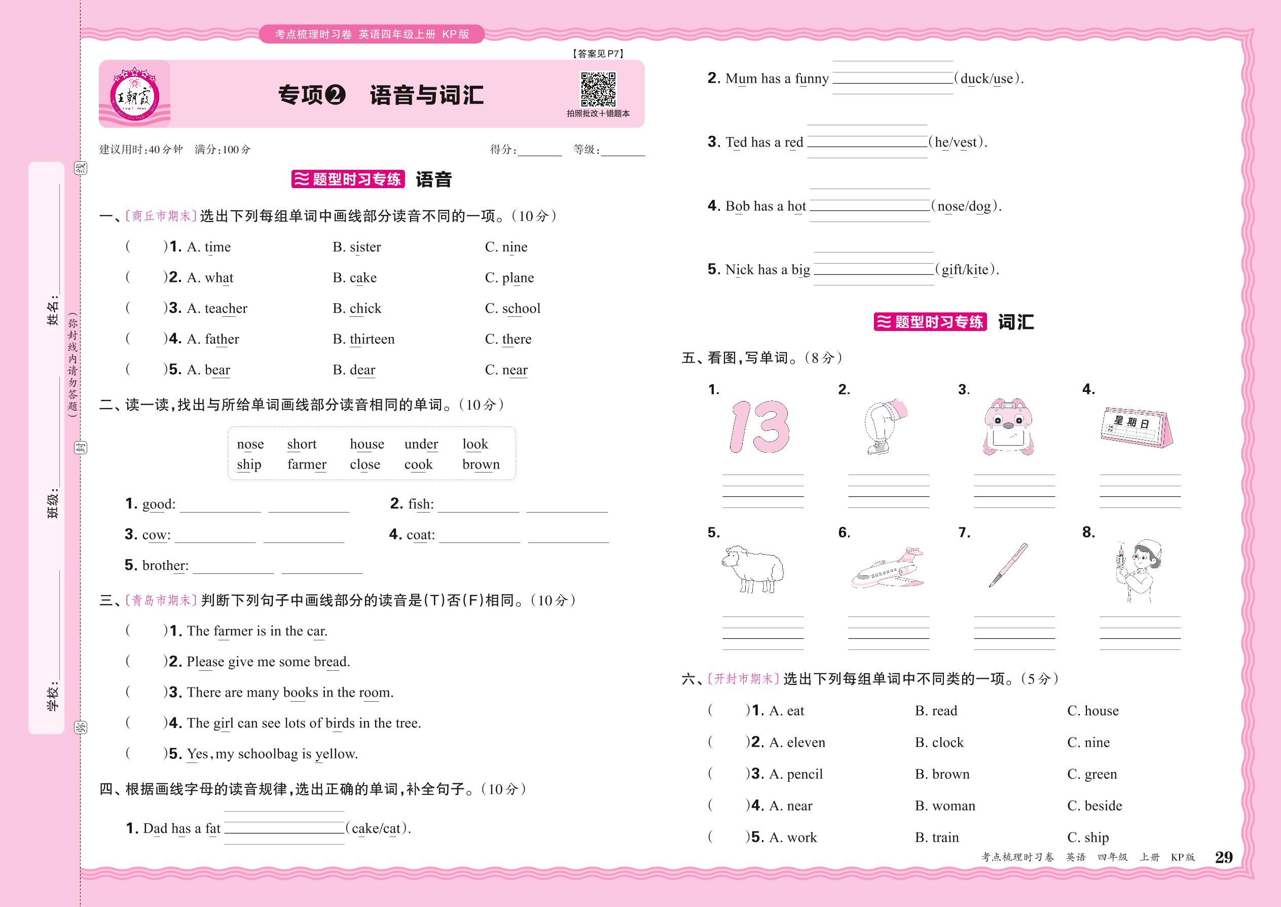 2024秋上册四年级英语科普版 期末专项卷KD版·语音与词汇【2】