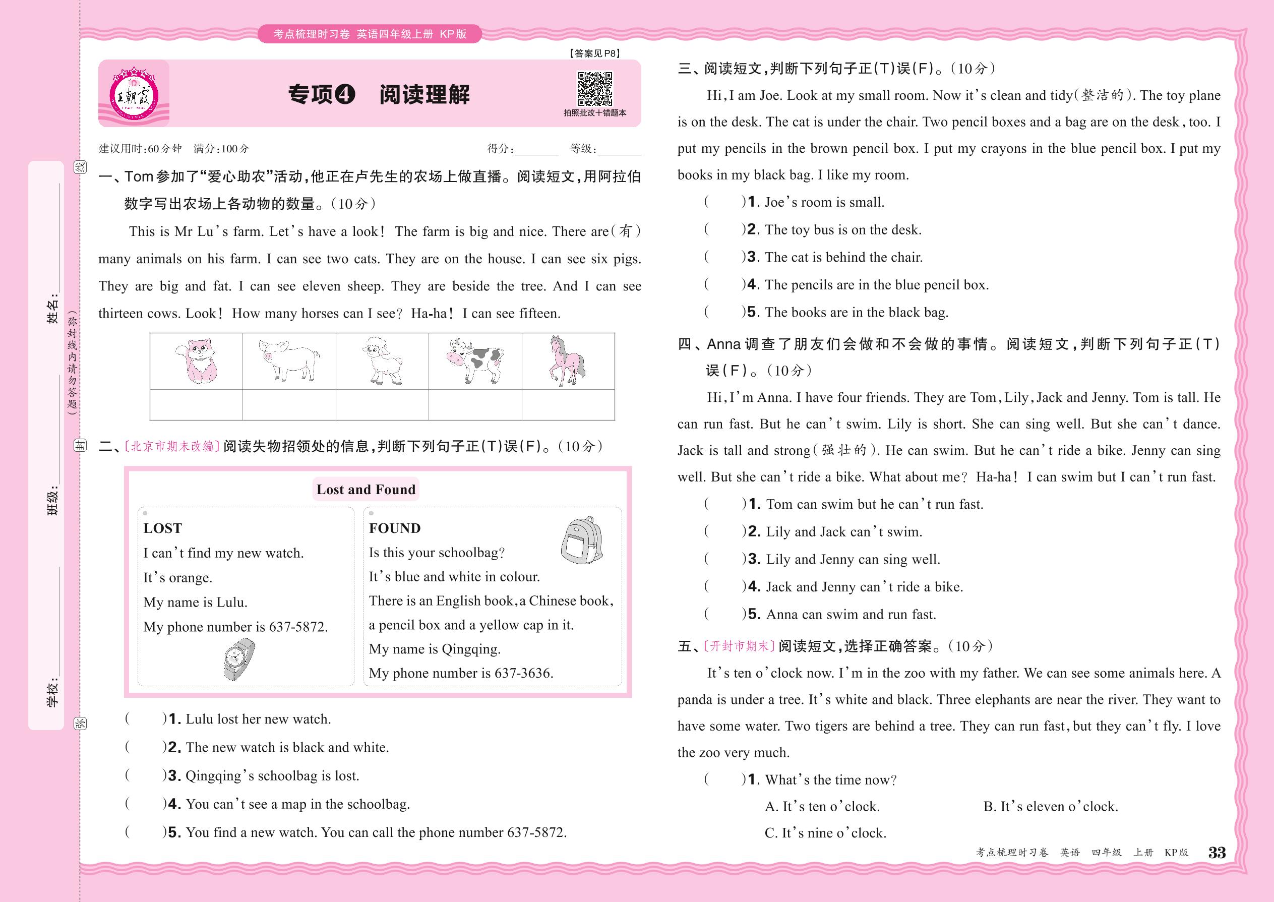 2024秋上册四年级英语科普版 期末专项卷KD版·阅读理解【4】