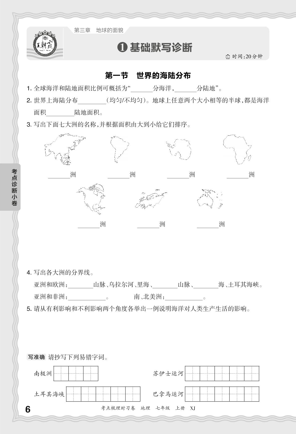 2024秋上册七年级地理湘教版 第三章 考点诊断小卷 基础默写诊断【1】