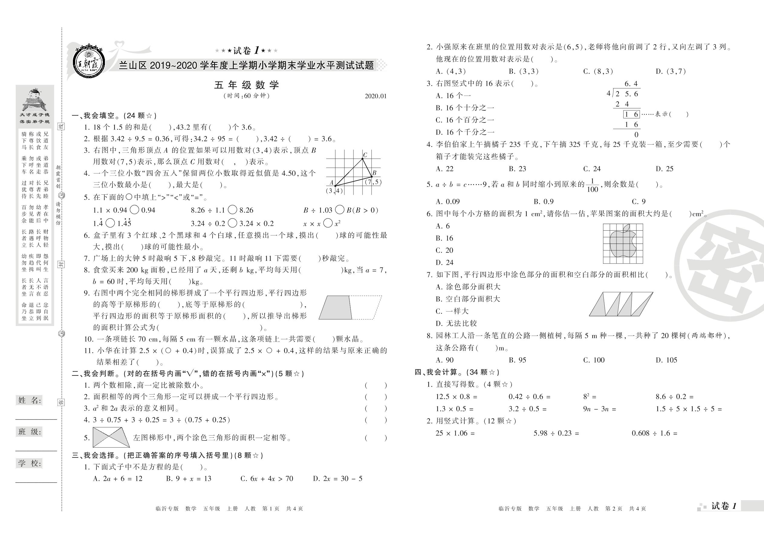 2019-2020学年第一学期临沂市兰山区五年级数学试卷(人教版)【1】