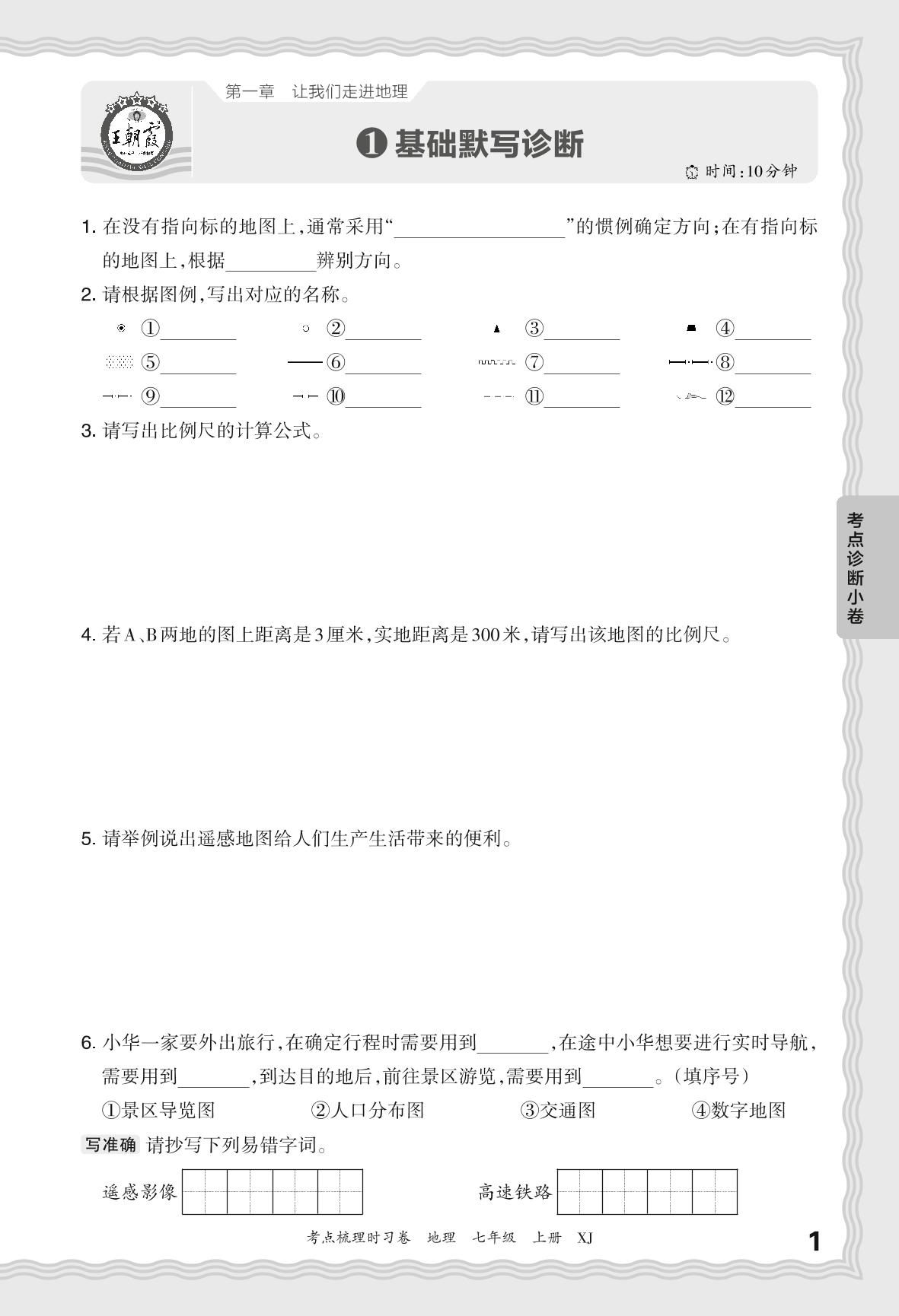 2024秋上册七年级地理湘教版 第一章 考点诊断小卷 基础默写诊断【1】