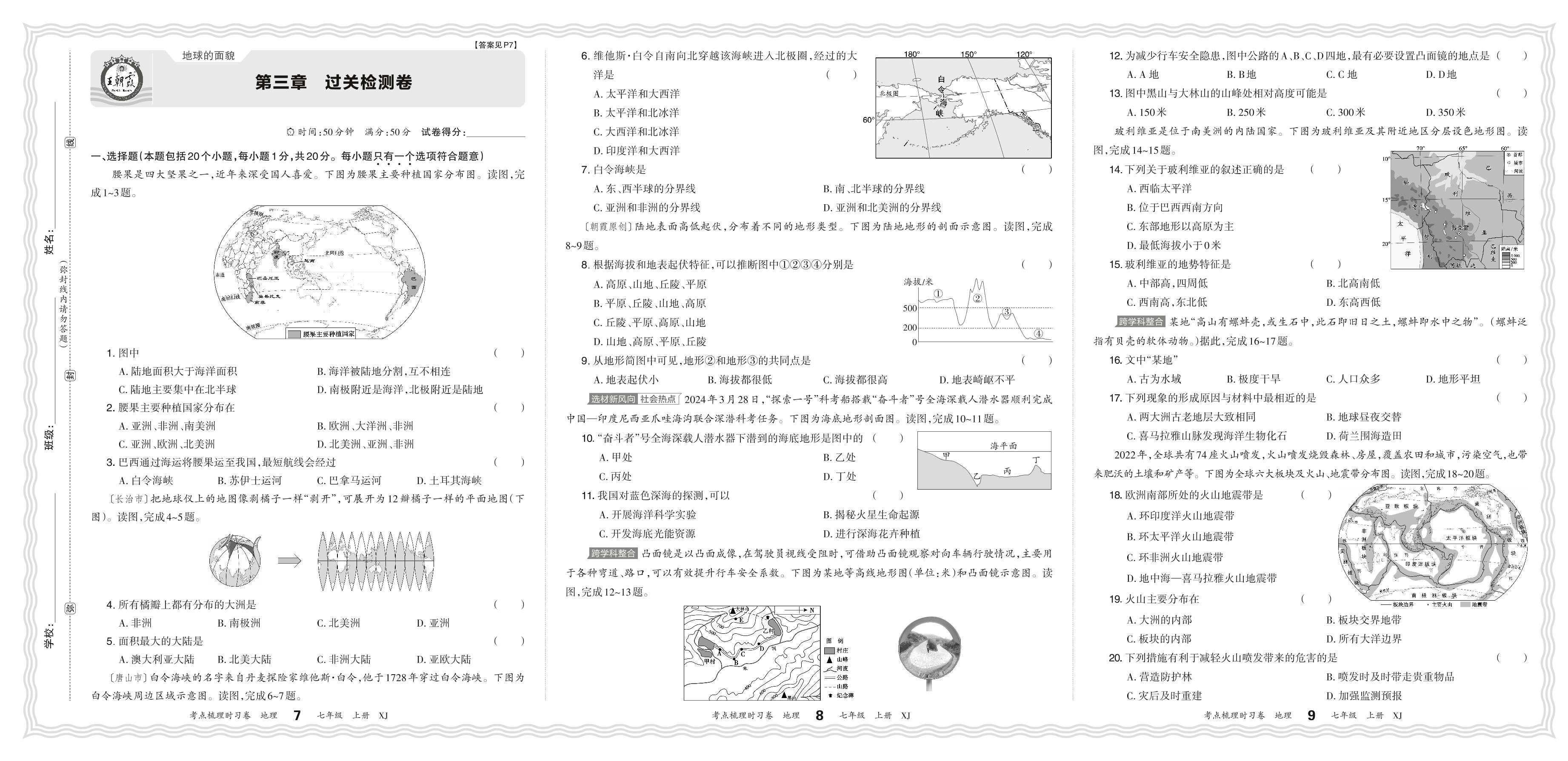 2024秋上册七年级地理湘教版 第三章 过关检测卷