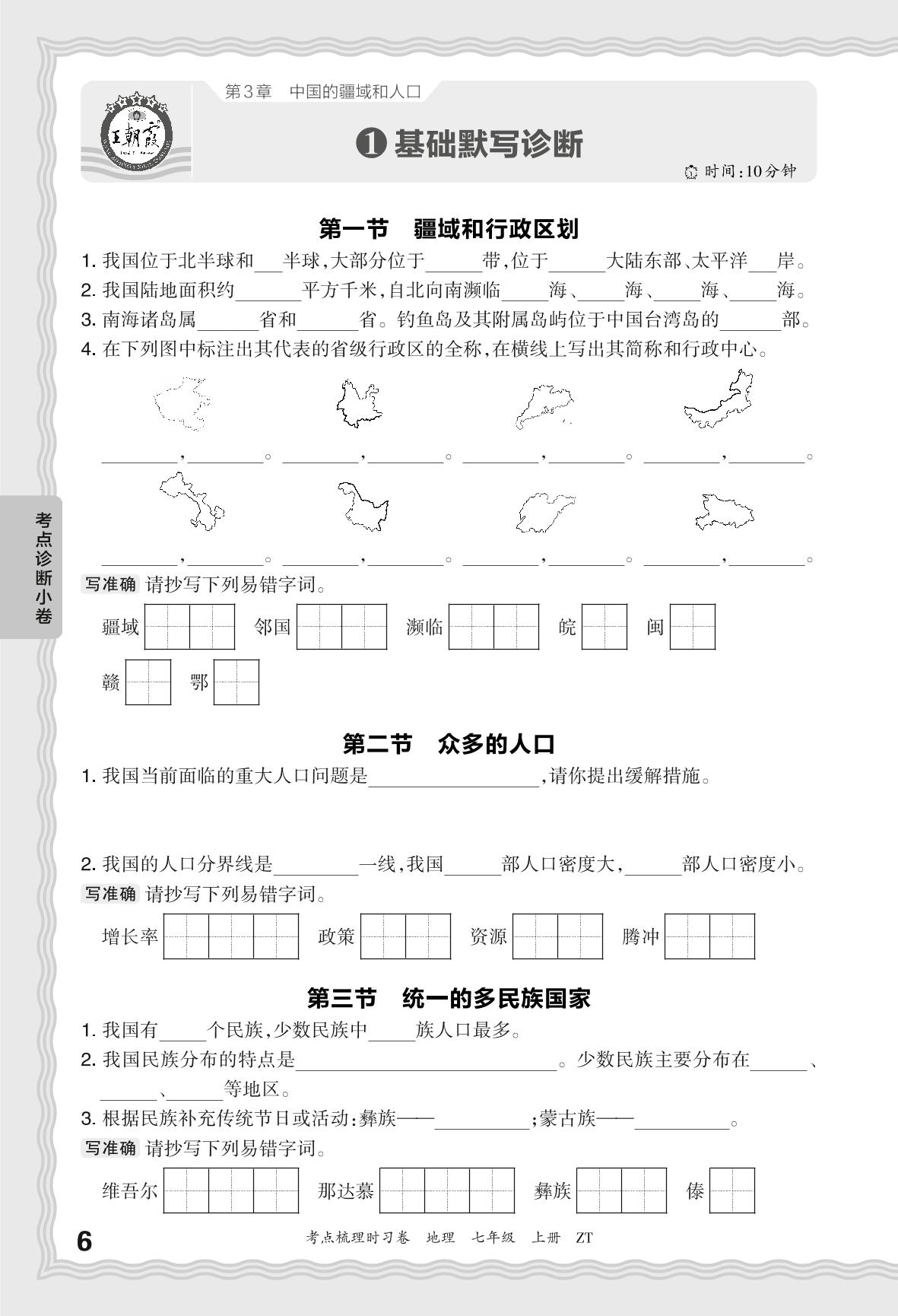 2024秋上册七年级地理中图版 第3章 考点诊断小卷 基础默写诊断【1】