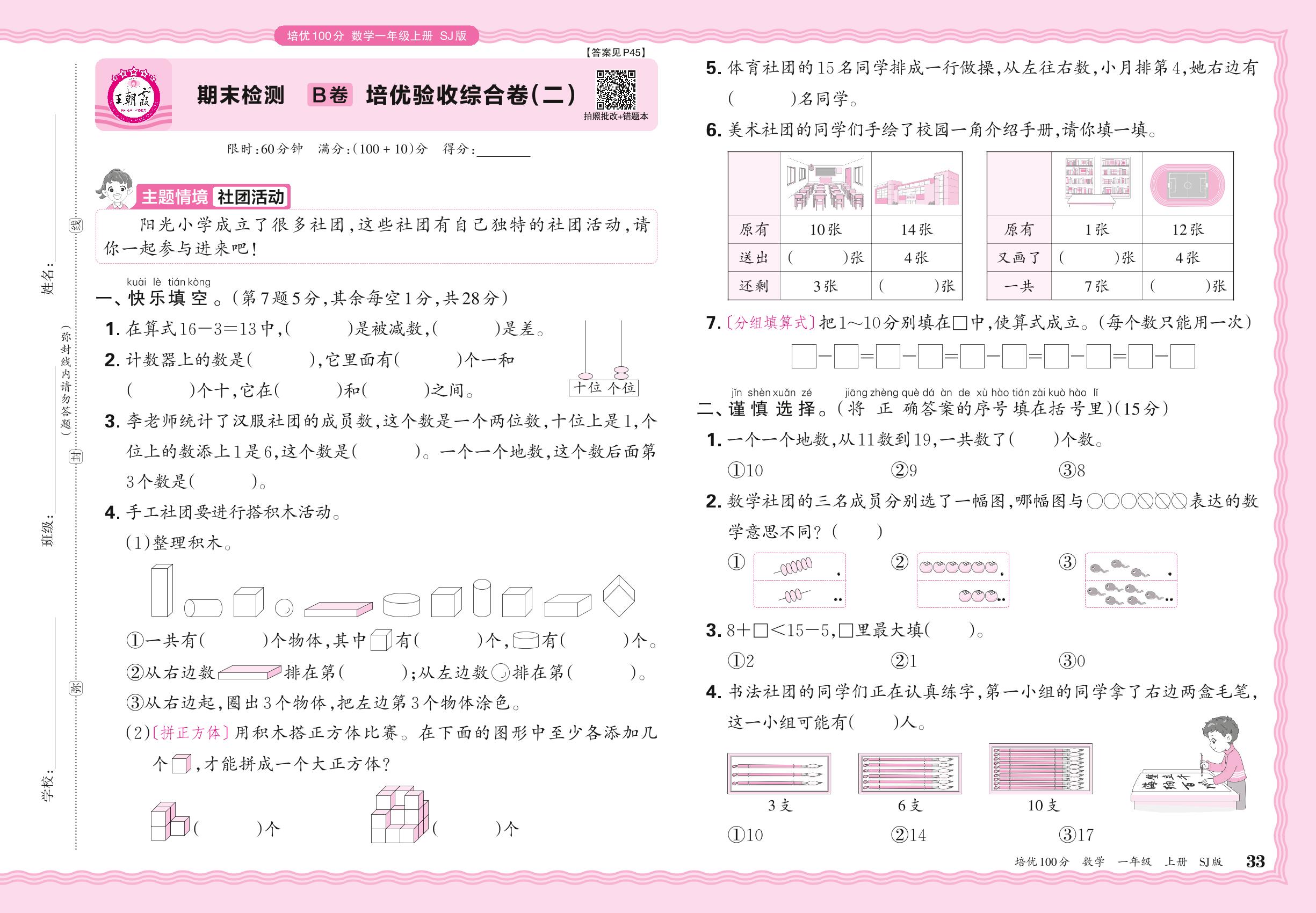2024秋上册一年级数学苏教版 期末检测B卷 培优验收综合卷(二)