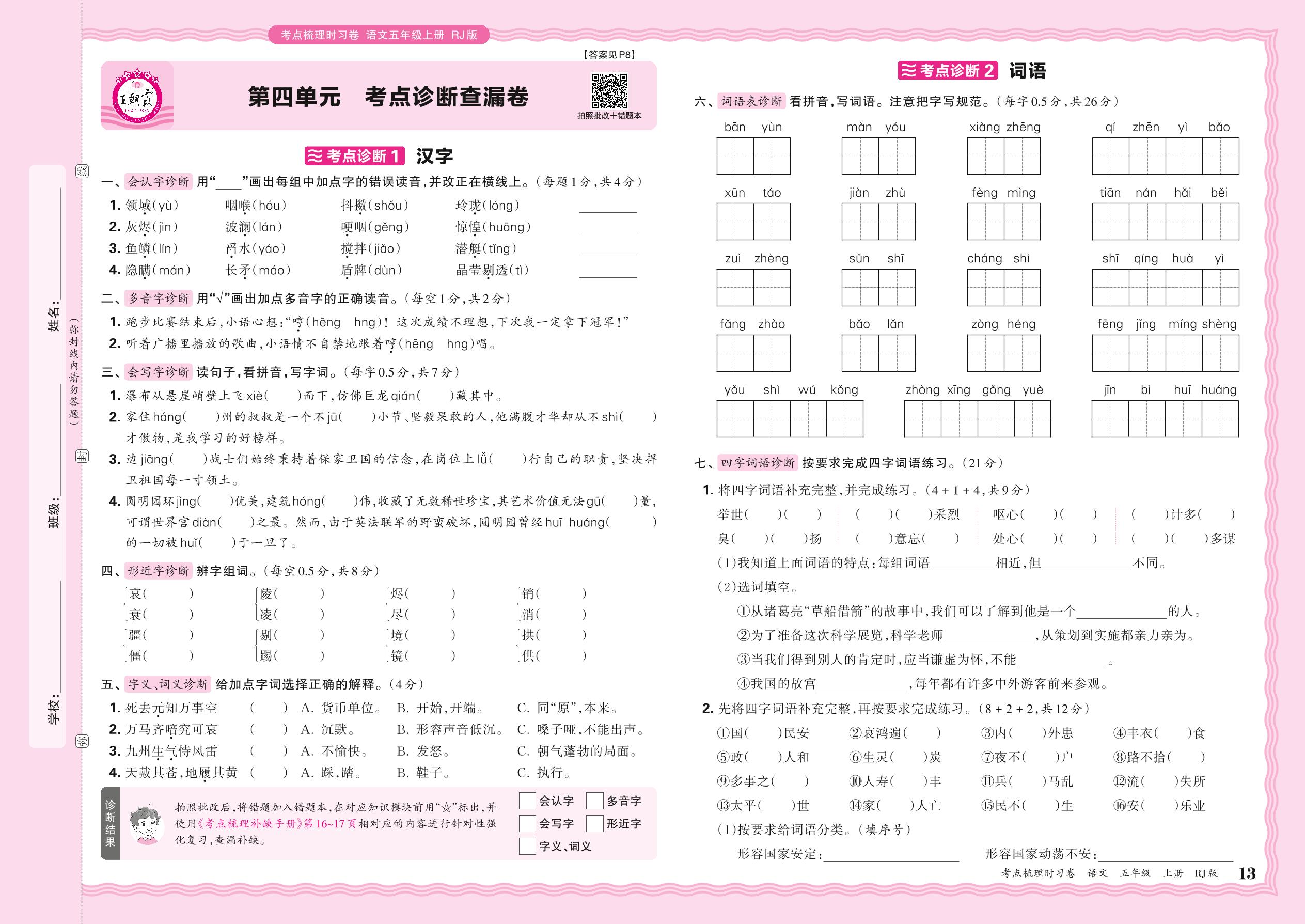 2024秋上册五年级语文人教版 第四单元 考点诊断查漏卷