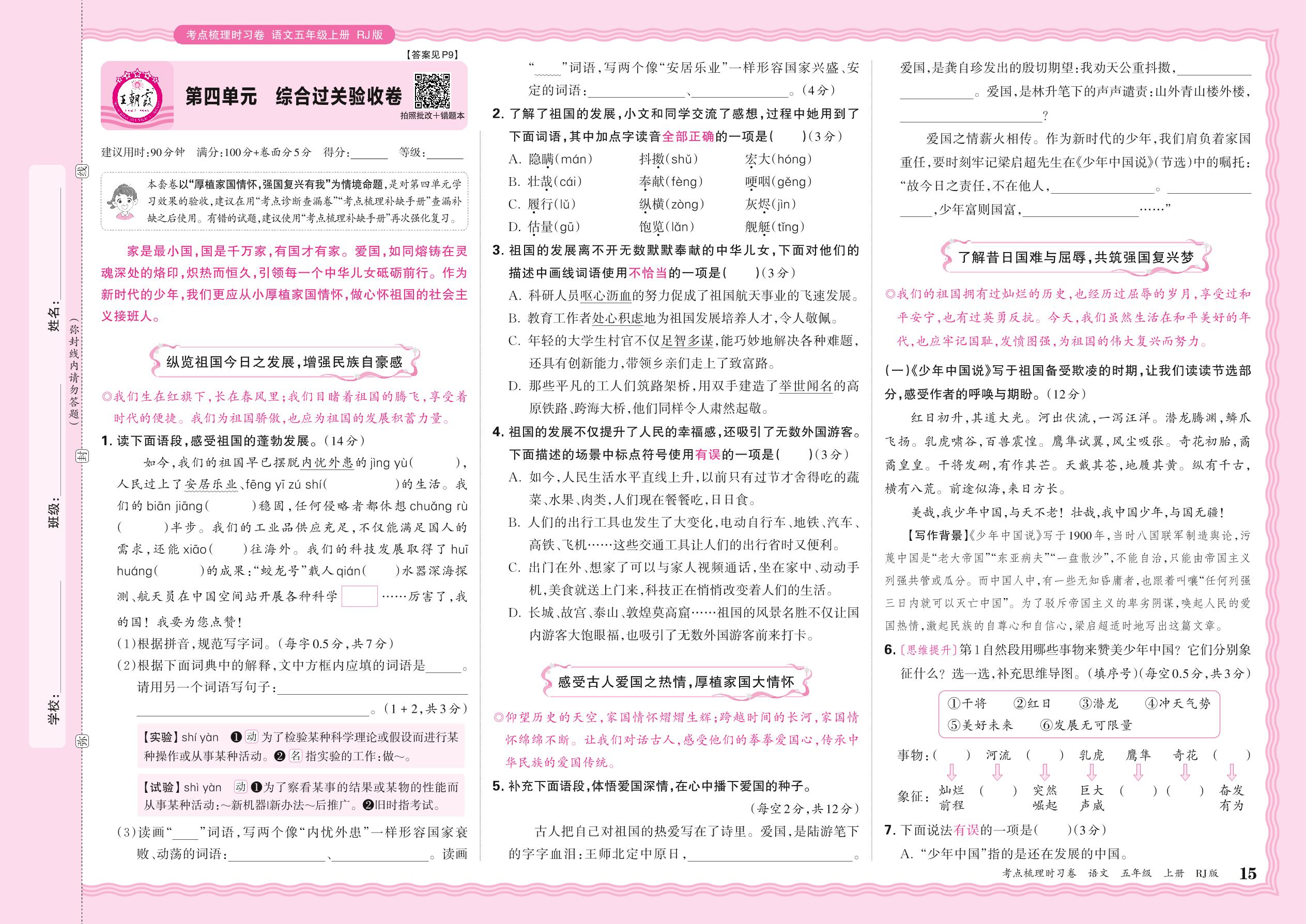 2024秋上册五年级语文人教版 第四单元 综合过关验收卷