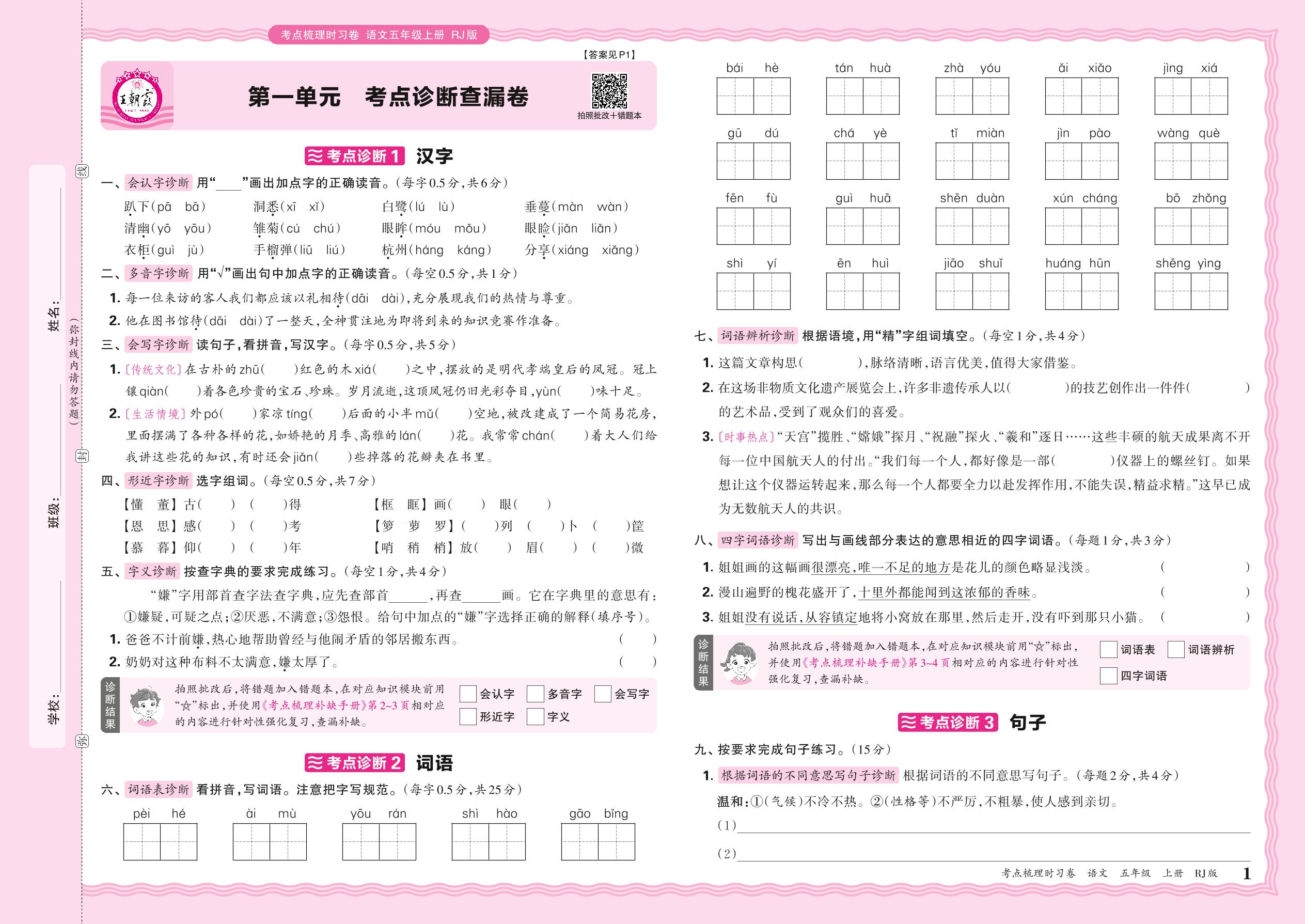 2024秋上册五年级语文人教版 第一单元 考点诊断查漏卷