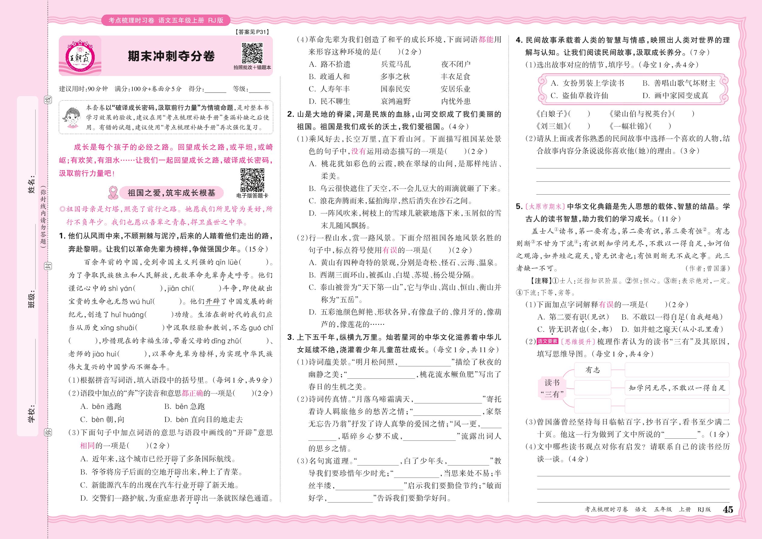 2024秋上册五年级语文人教版 期末冲刺夺分卷