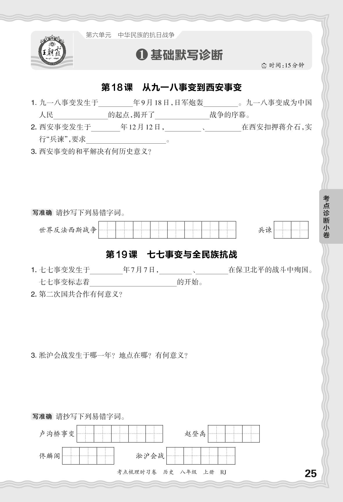 2024秋上册八年级历史人教版 考点诊断小卷——第六单元 基础默写诊断
