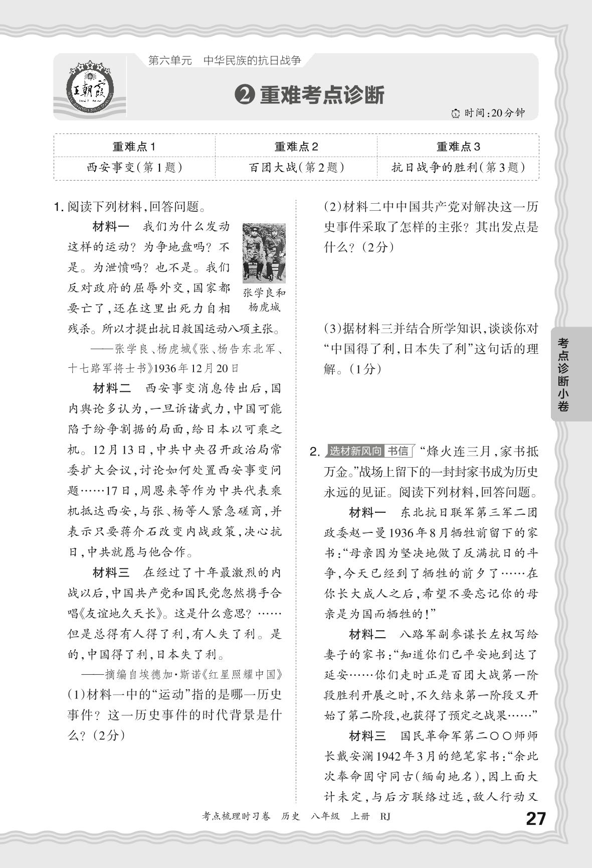 2024秋上册八年级历史人教版 考点诊断小卷——第六单元 重难考点诊断