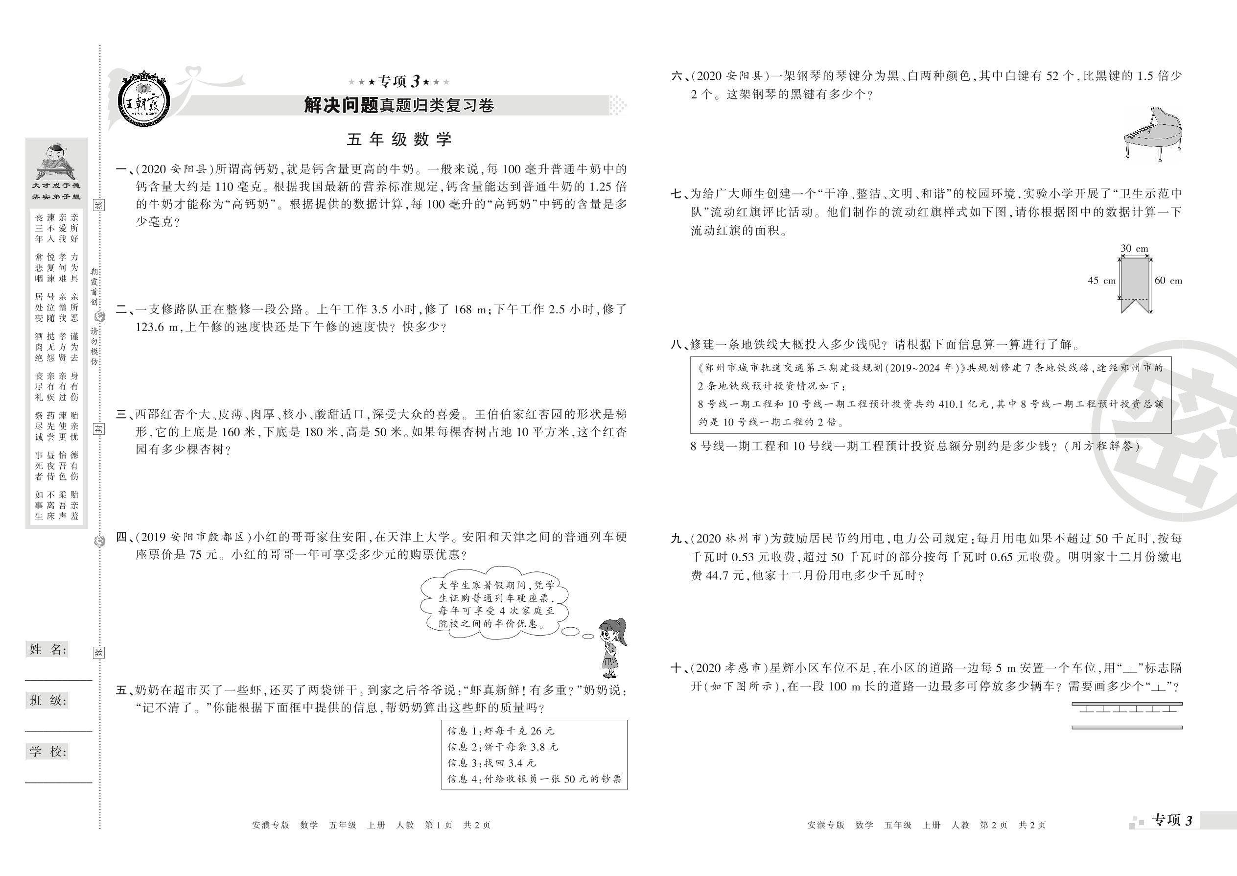 王朝霞期末专项卷——解决问题真题归类复习、新颖题速递:生活与数学五年级上册数学(人教版)_R210804164403【0】