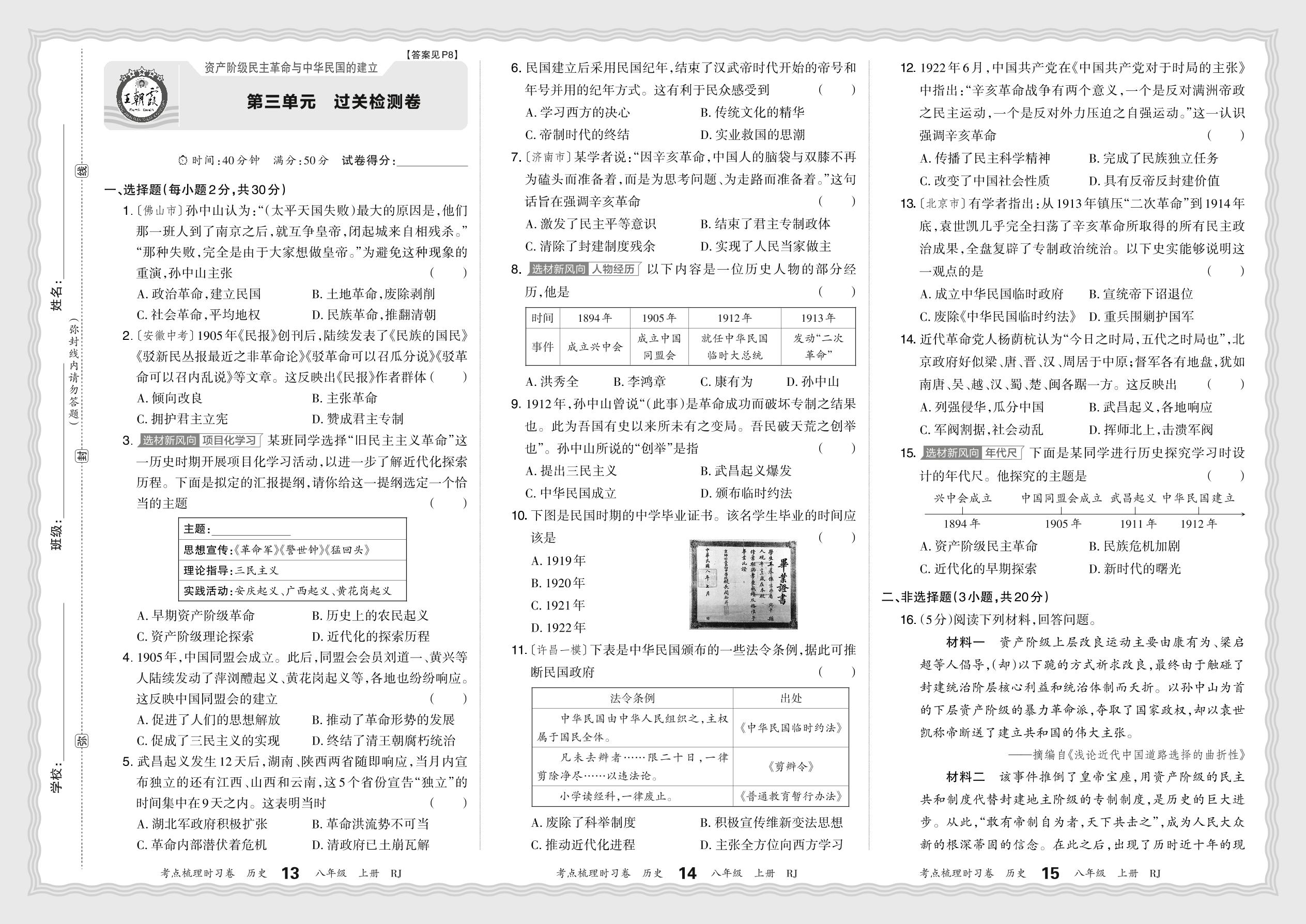 2024秋上册八年级历史人教版 第三单元 过关检测卷