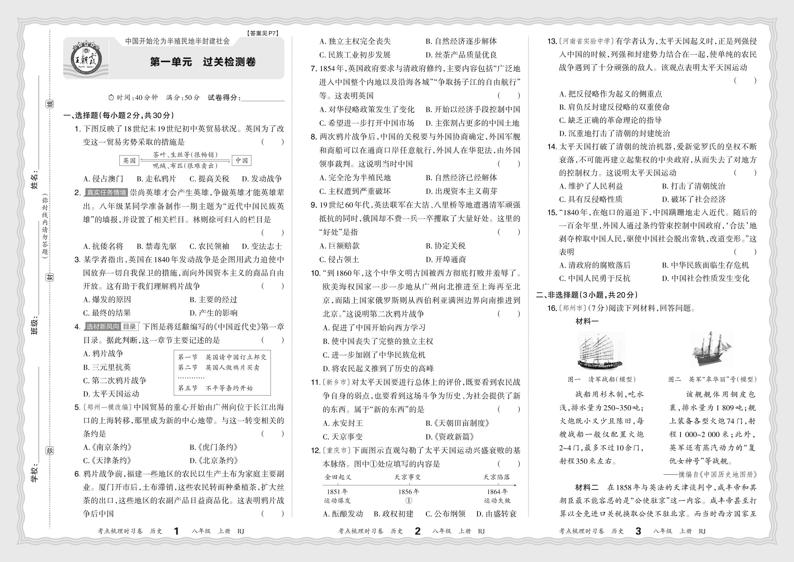 2024秋上册八年级历史人教版 第一单元 过关检测卷