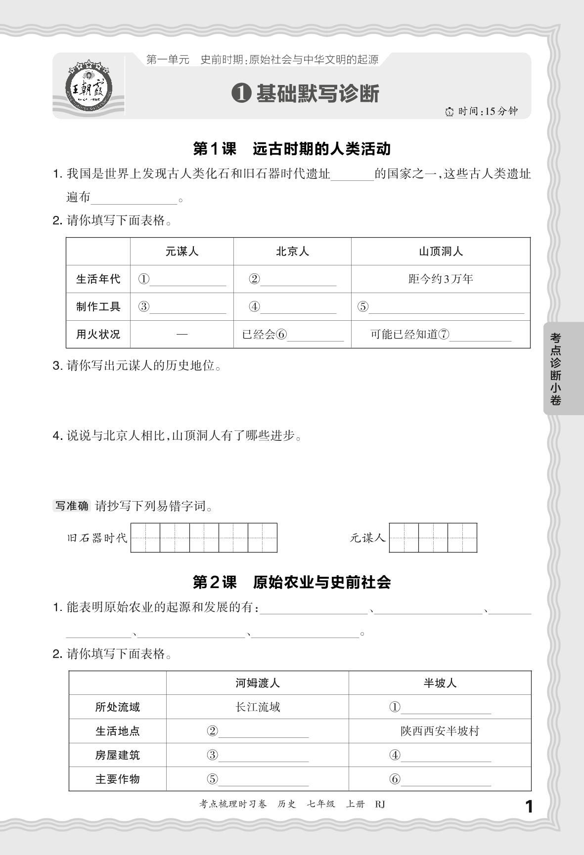 2024秋上册七年级历史人教版 考点诊断小卷——第一单元 基础默写诊断