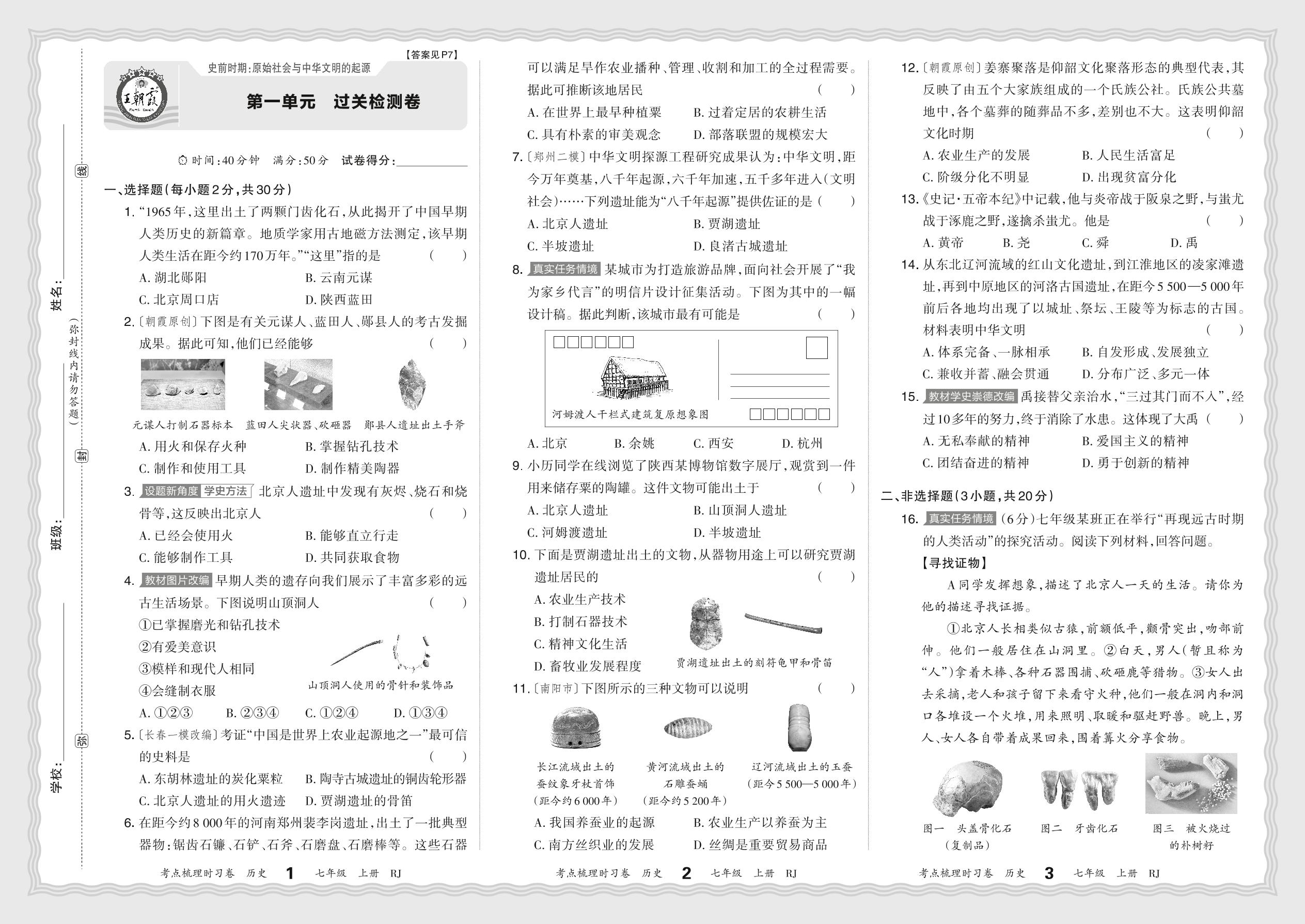 2024秋上册七年级历史人教版 第一单元 过关检测卷