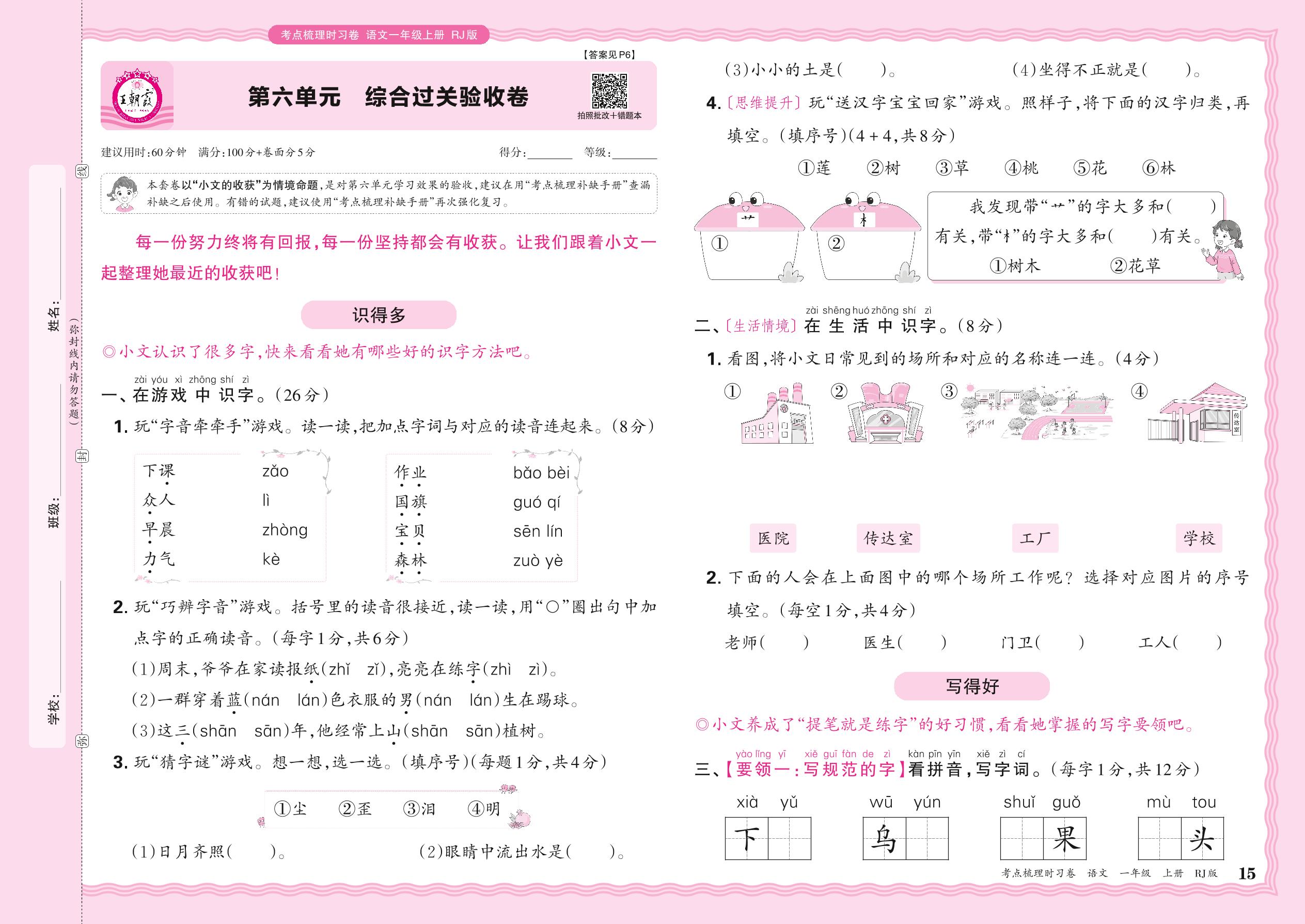 2024秋上册一年级语文人教版 第六单元 综合过关验收卷