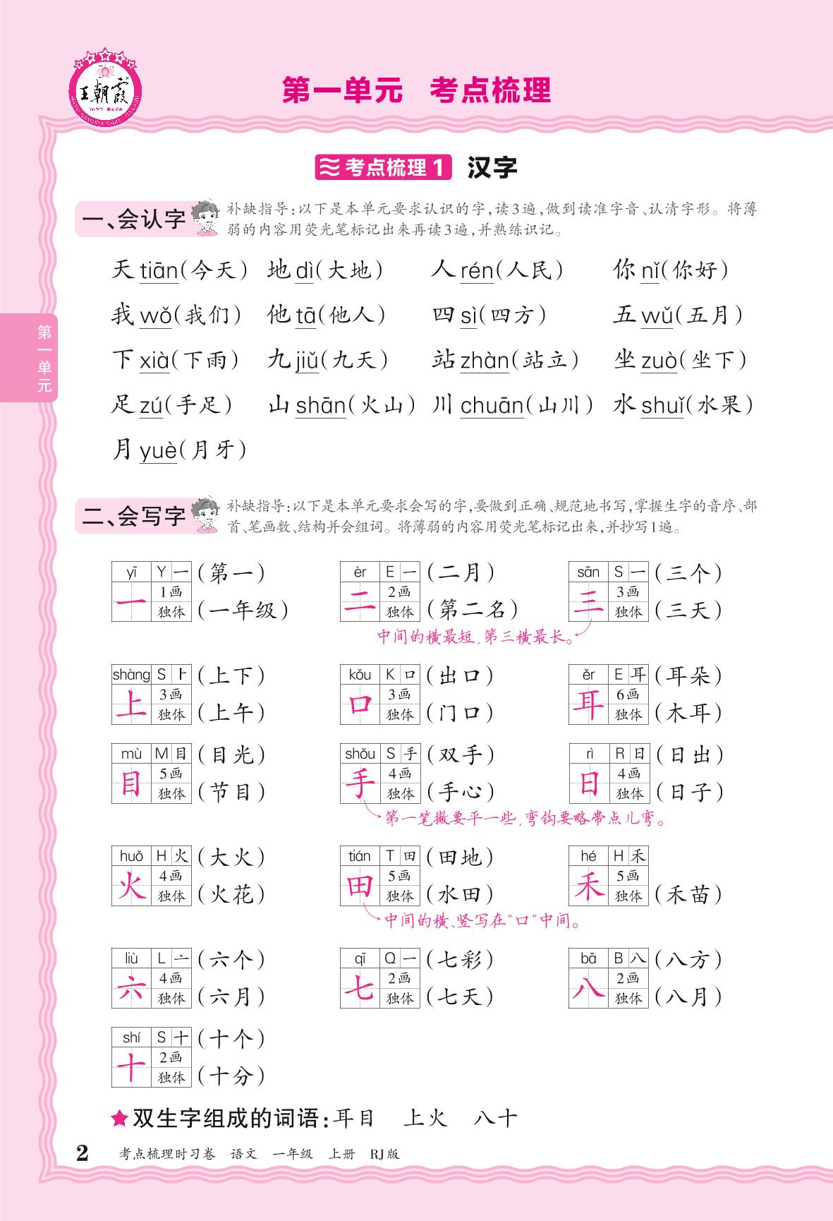 2024秋上册一年级语文人教版 考点梳理补缺手册——第一单元 考点梳理