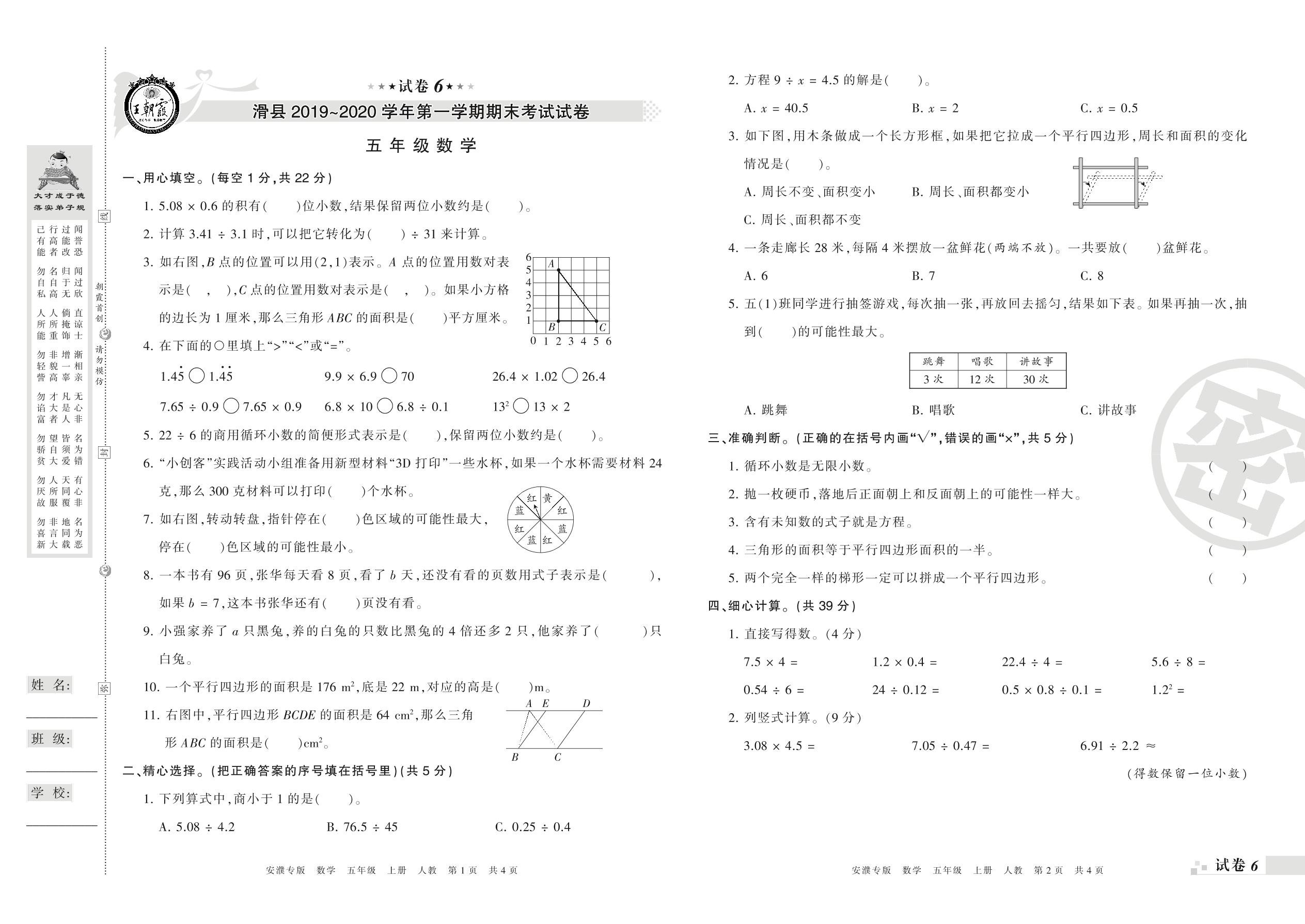 2019-2020学年第一学期安阳市滑县五年级数学试卷(人教版)【6】