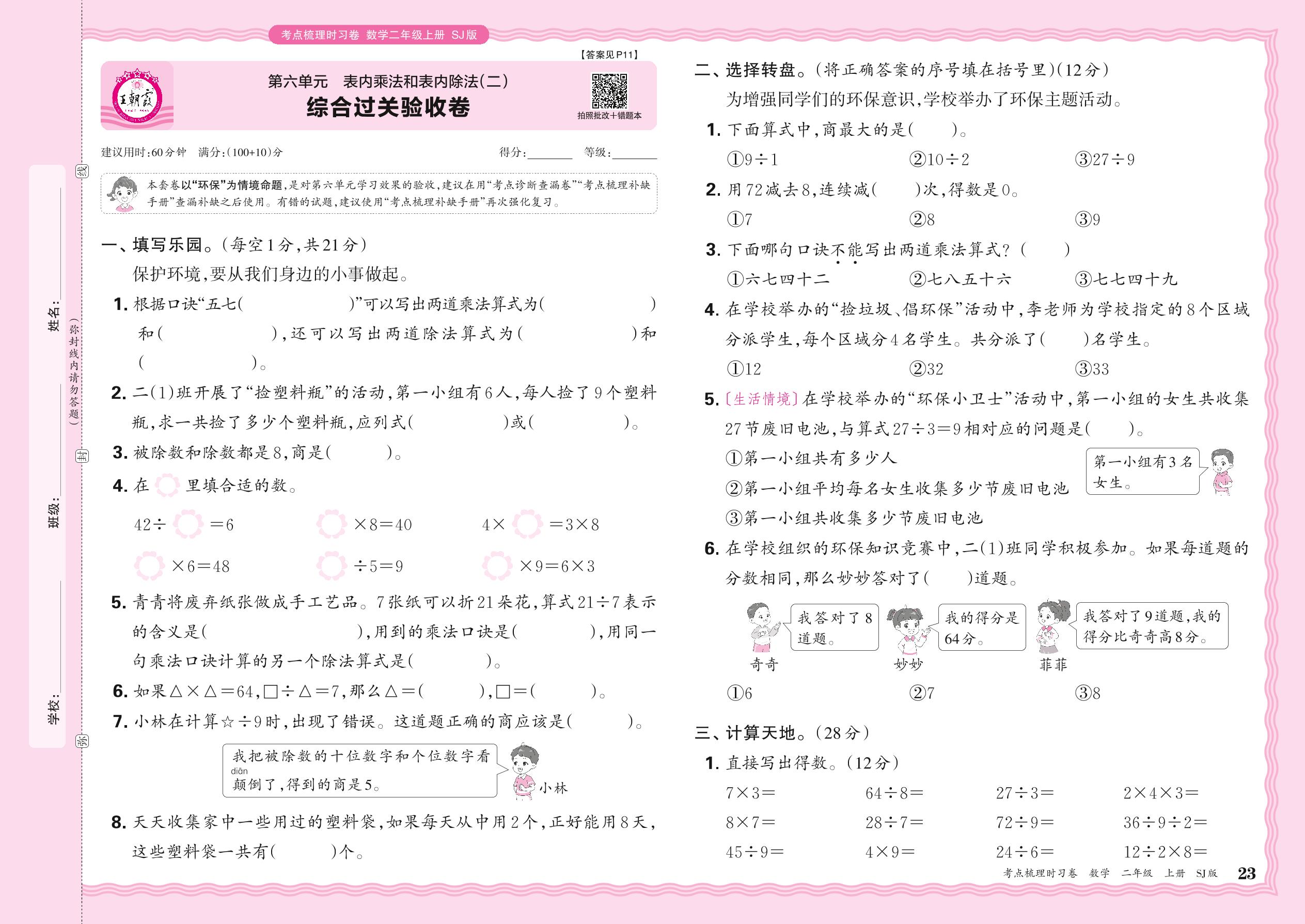 2024秋上册二年级数学苏教版 第六单元 综合过关验收卷
