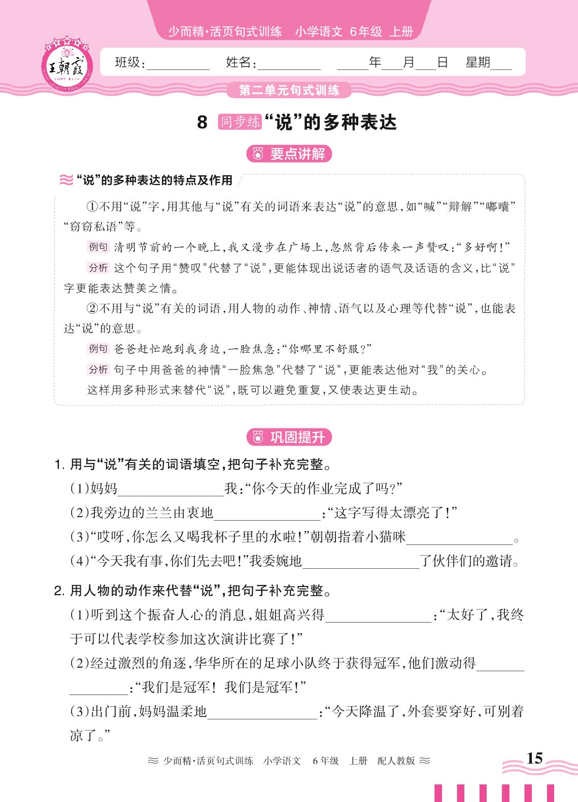 2024秋上册六年级语文人教版 第二单元句式训练——8. “说”的多种表达