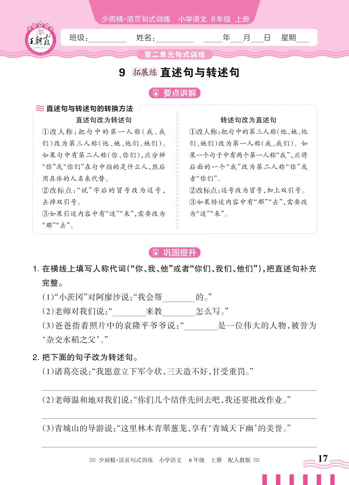 2024秋上册六年级语文人教版 第二单元句式训练——9. 直述句与转述句