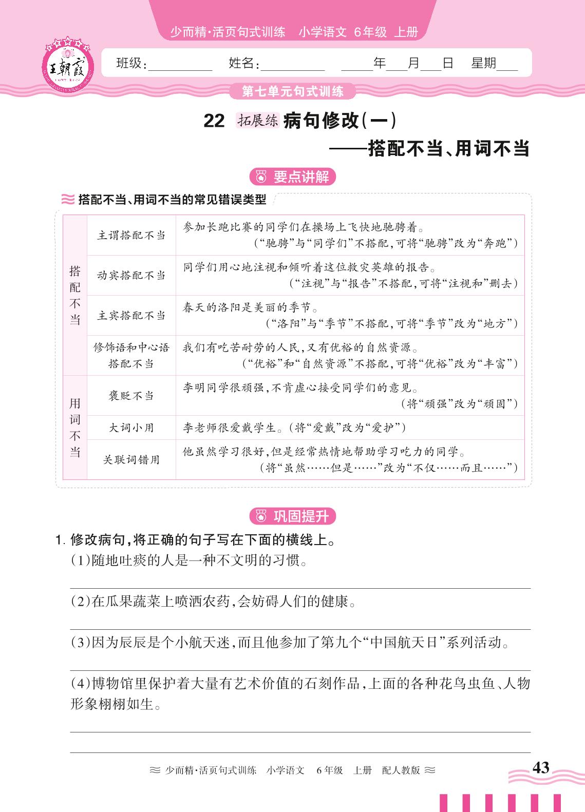 2024秋上册六年级语文人教版 第七单元句式训练——22. 病句修改一:搭配不当、用词不当