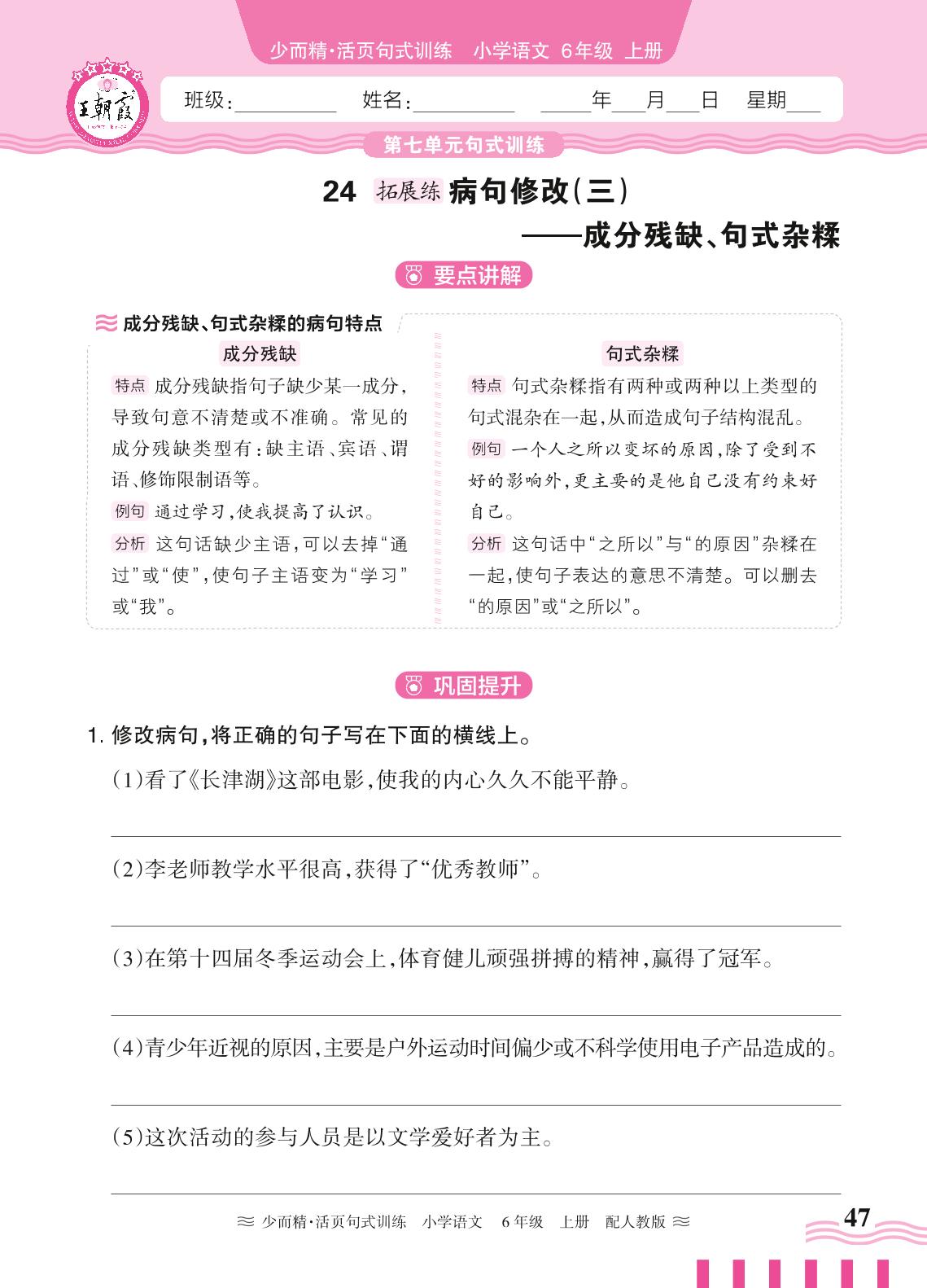 2024秋上册六年级语文人教版 第七单元句式训练——24. 病句修改三:成分残缺、句式杂糅