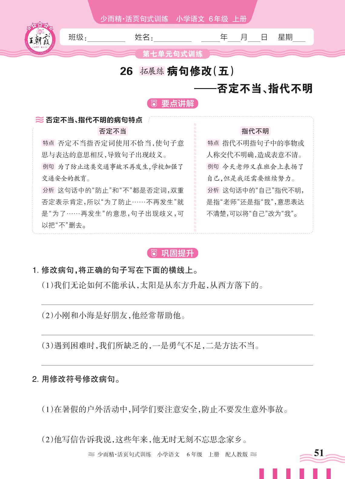 2024秋上册六年级语文人教版 第七单元句式训练——26. 病句修改五:否定不当、指代不明